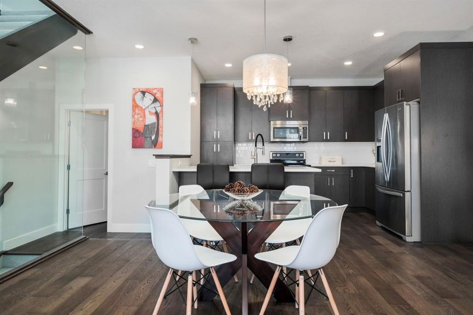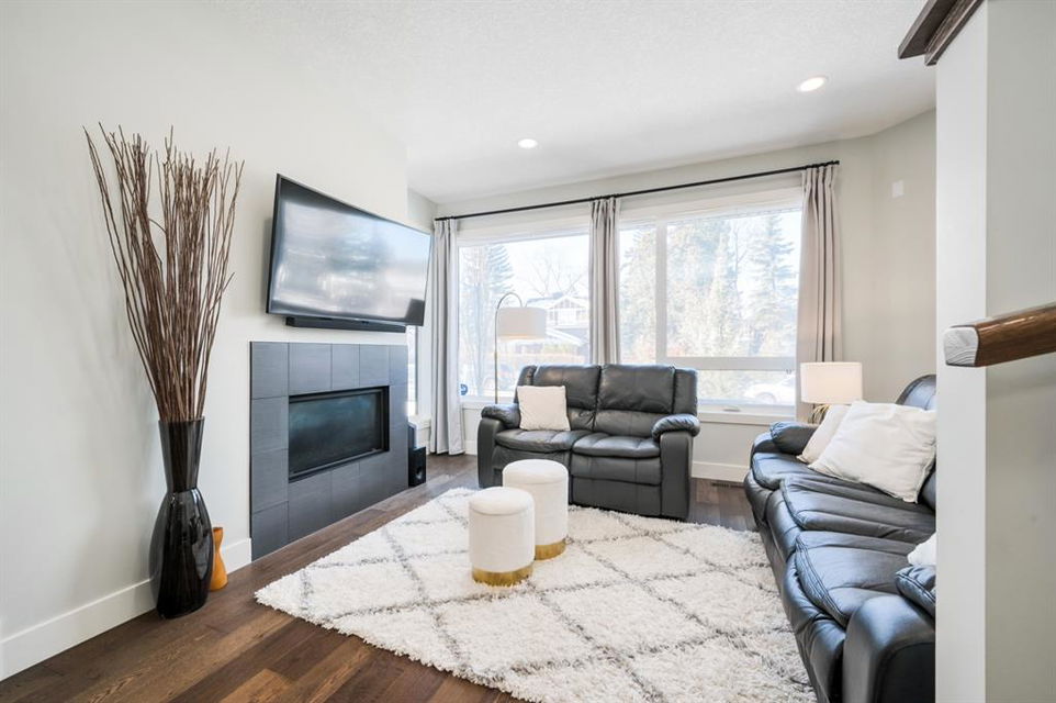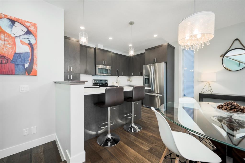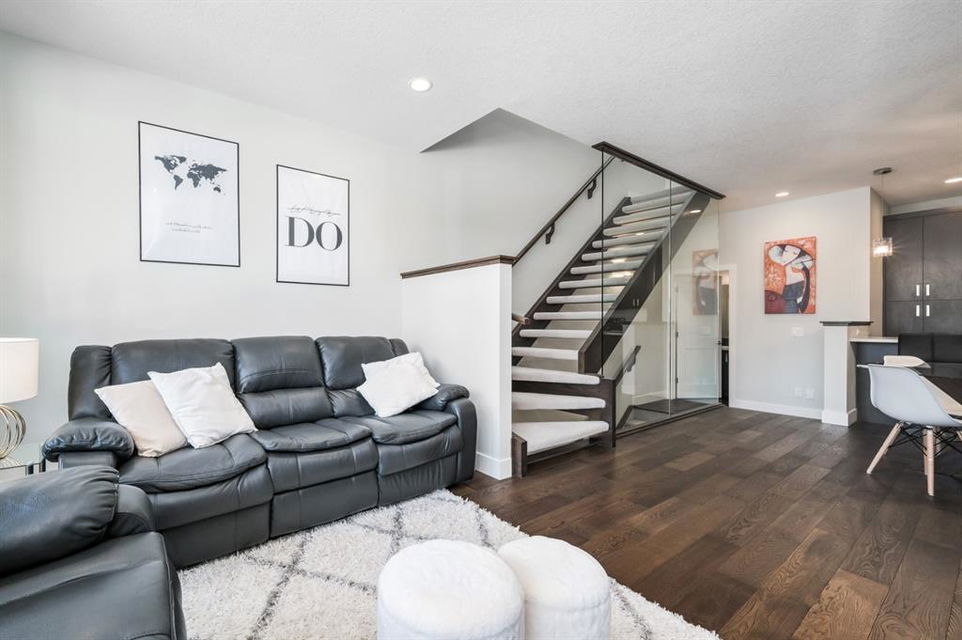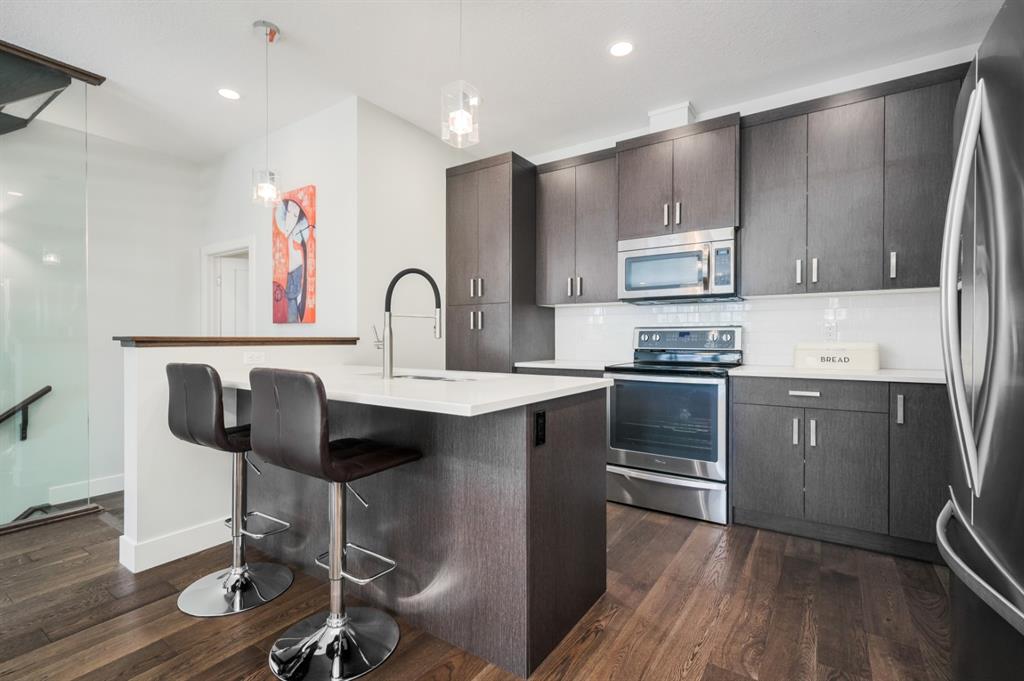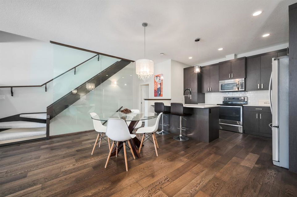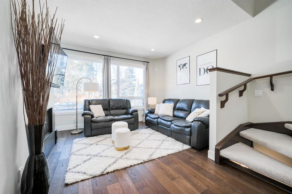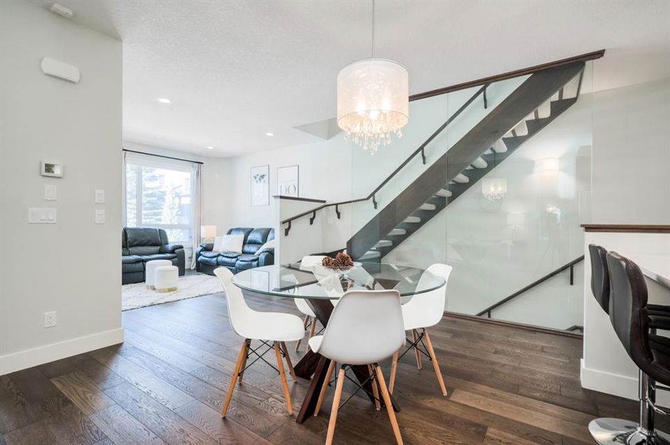 Welcome to this stunning modern gem kept in immaculate condition! An Entirely upgraded 4 plex in family friendly Richmond. Steps to 17th Ave and minutes to Downtown, Shaganappi LRT and local amenities. This modern townhome boasts a fresh and bright open concept with a total of 3 bedrooms and 3.5 bathrooms! Main floor, with 9ft ceilings, expansive windows, large entryway, 2 pc bath and Engineered hardwood throughout. Large dining area complete with chandelier and floor to ceiling modern glass feature wall leads to an open Living area with cozy gas fireplace. The upscale kitchen features an eat-in Peninsula Island, modern white backsplash, glistening quartz countertops and stainless steel appliances. Open riser staircase with feature glass leads you to the upper level featuring two master bedrooms with en suites one upgraded and refinished in a beautiful white Cacutta tile. Both bedrooms also have walk in closets, large windows & upper level laundry! Basement is completely developed with 9 foot ceilings, large 3rd bedroom, another full bathroom and large rec room. Close to schools, parks, transit and downtown, this house is an exceptional opportunity in one of Calgary’s most desired neighborhoods. Includes one single indoor parking space as well as Air Conditioning throughout the unit! With almost 2000 square feet of developed modern living space, endless features and close to everything you need! Don’t forget to check pout the video tour! Cove view today before its gone!