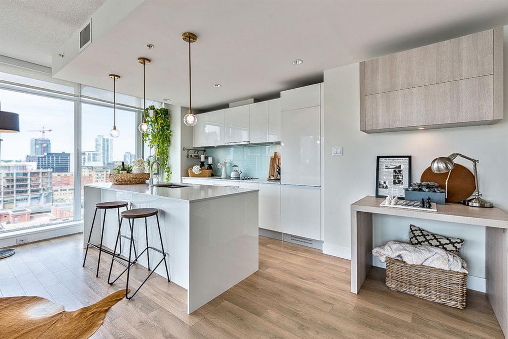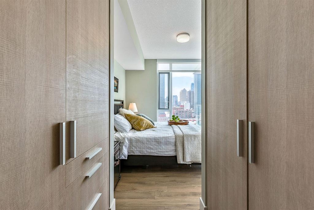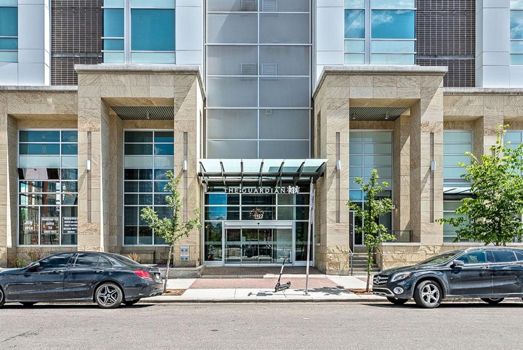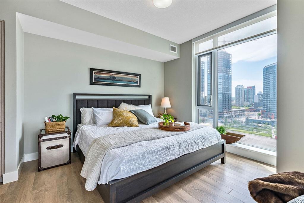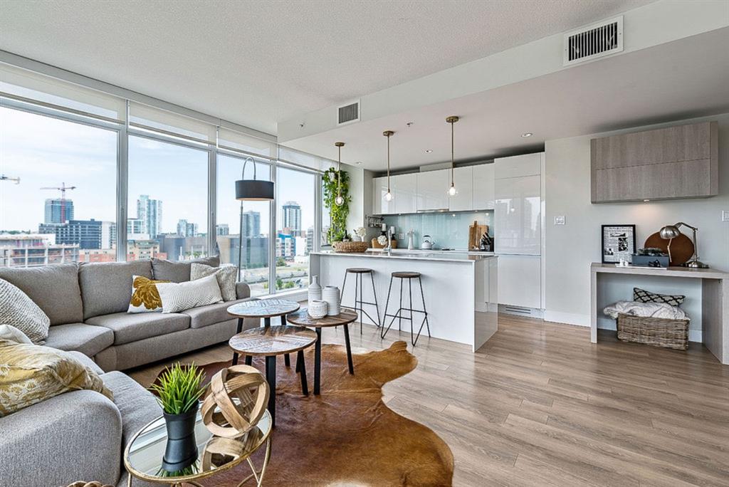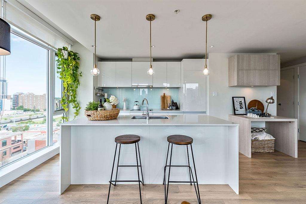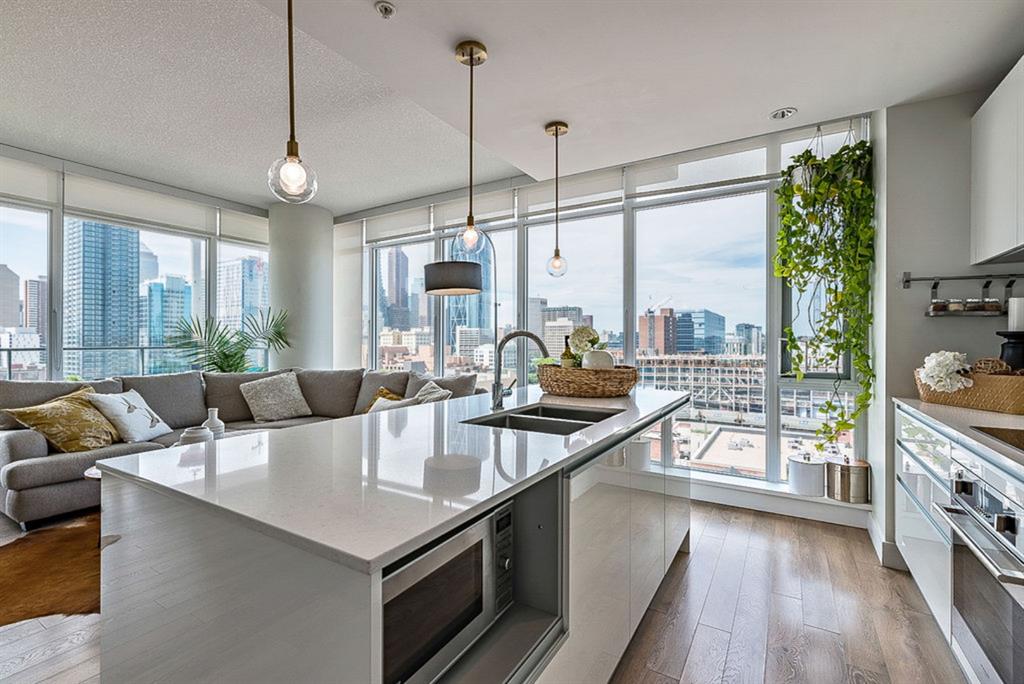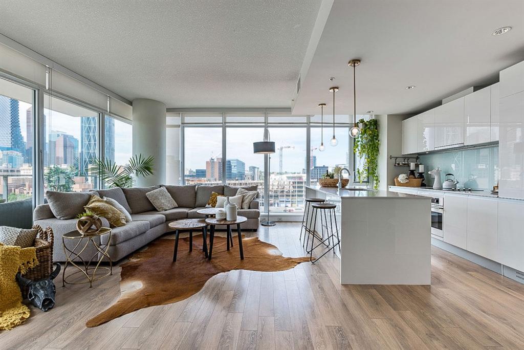 **Click 3D for VIRTUAL TOUR** –> STUNNING, CONTEMPORARY & LUXURIOUS 884SQ.FT CORNER UNIT w 2 BDRM 2BATH on the tenth floor of one of the newest residential high-rises in the heart of urban YYC! With FLOOR-TO-CEILING WINDOWS, CITY/MOUNTAIN VIEWS, and exquisite finishing throughout, this unit clearly exudes elegance, sophistication & style. Offers extensive upgrades with light laminate flooring, CUSTOM BUILT-IN CLOSETS, travertine tile, large chef’s kitchen with European appliances, quartz countertop & island. Open concept living room is wrapped with floor-to-ceiling glass and features views of mountains & YYC skyline all around. Master bedroom offers over-sized windows, walk-through custom closet and ensuite bathroom. Second bedroom or home office, private balcony, second bathroom, in-suite laundry, additional storage closets, PLUS TITLED DOUBLE INDOOR PARKING complete this unit. The building has great amenities incl/concierge service, 24 hour security, visitor parking, gym, yoga studio, residence lounge w/garden terrace for entertaining, bike room & workshop. Located in the heart of urban Calgary, steps from East Village, Stampede Park, Downtown, LRT, New Library, National Music Center, Shopping, Coffee Shops, Restaurants, River Pathways, Inglewood, & more. The Guardian allows for Airbnb. Truly, your options to live, work and play are endless!
