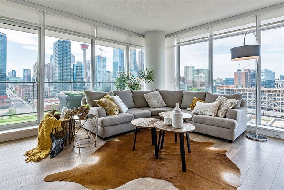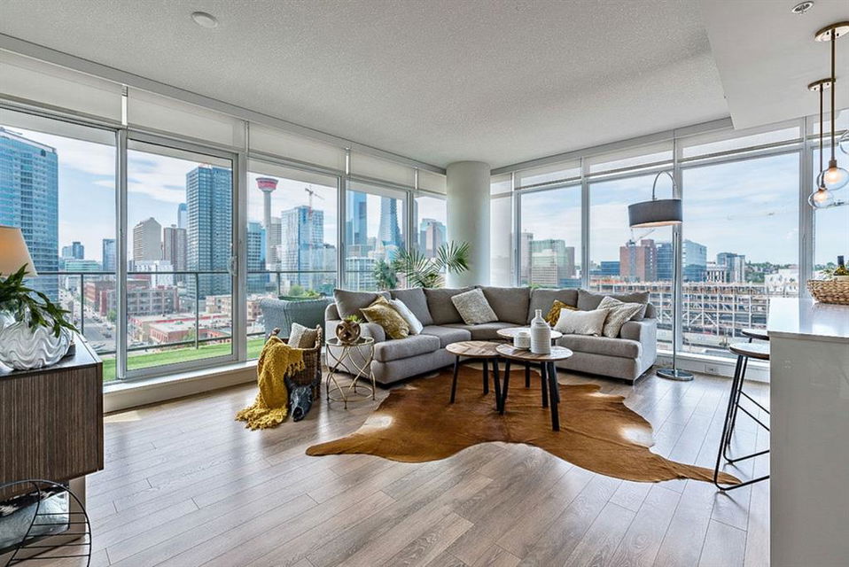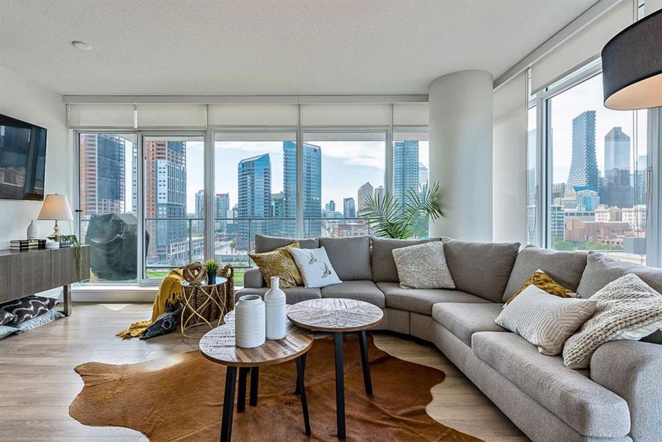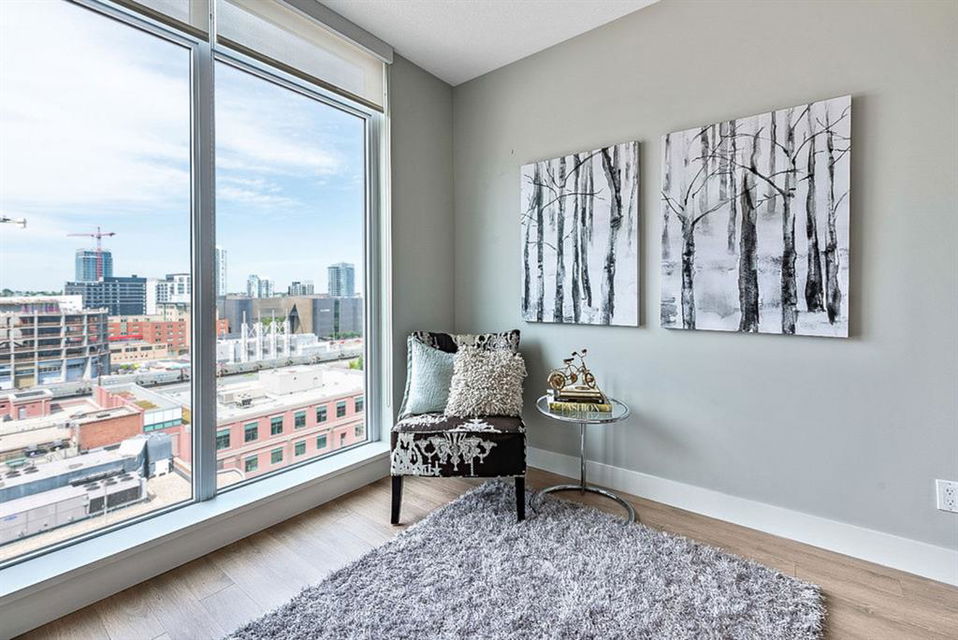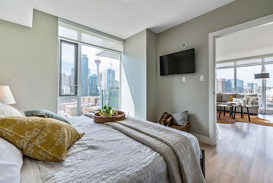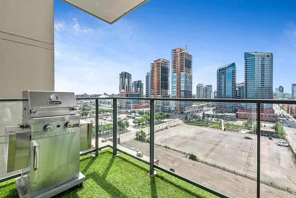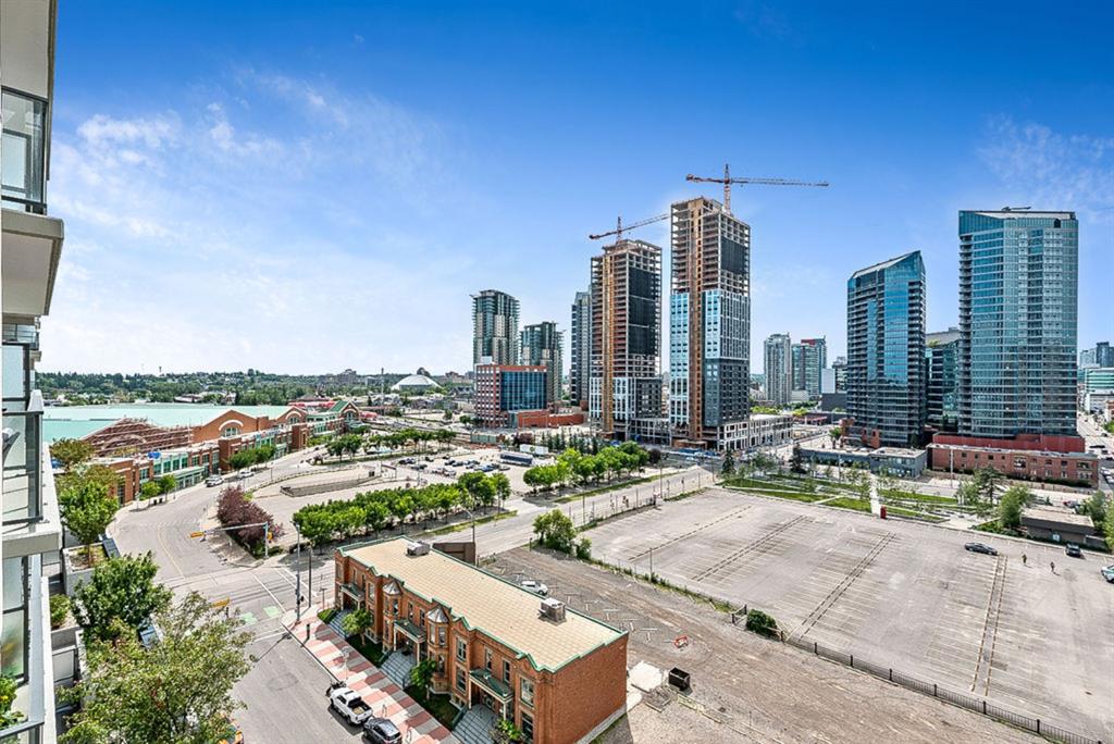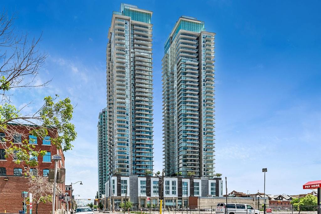 **Click 3D for VIRTUAL TOUR** –> STUNNING, CONTEMPORARY & LUXURIOUS 884SQ.FT CORNER UNIT w 2 BDRM 2BATH on the tenth floor of one of the newest residential high-rises in the heart of urban YYC! With FLOOR-TO-CEILING WINDOWS, CITY/MOUNTAIN VIEWS, and exquisite finishing throughout, this unit clearly exudes elegance, sophistication & style. Offers extensive upgrades with light laminate flooring, CUSTOM BUILT-IN CLOSETS, travertine tile, large chef’s kitchen with European appliances, quartz countertop & island. Open concept living room is wrapped with floor-to-ceiling glass and features views of mountains & YYC skyline all around. Master bedroom offers over-sized windows, walk-through custom closet and ensuite bathroom. Second bedroom or home office, private balcony, second bathroom, in-suite laundry, additional storage closets, PLUS TITLED DOUBLE INDOOR PARKING complete this unit. The building has great amenities incl/concierge service, 24 hour security, visitor parking, gym, yoga studio, residence lounge w/garden terrace for entertaining, bike room & workshop. Located in the heart of urban Calgary, steps from East Village, Stampede Park, Downtown, LRT, New Library, National Music Center, Shopping, Coffee Shops, Restaurants, River Pathways, Inglewood, & more. The Guardian allows for Airbnb. Truly, your options to live, work and play are endless!