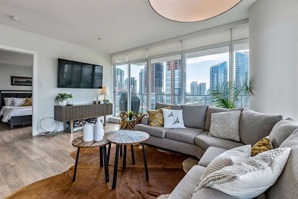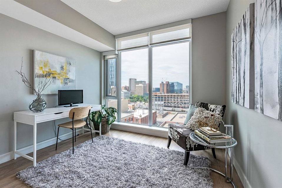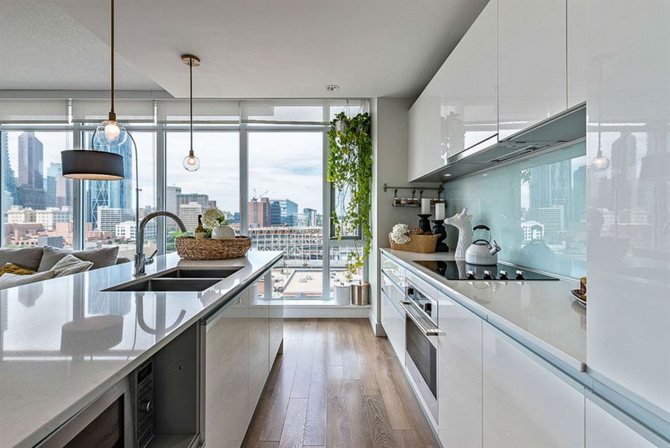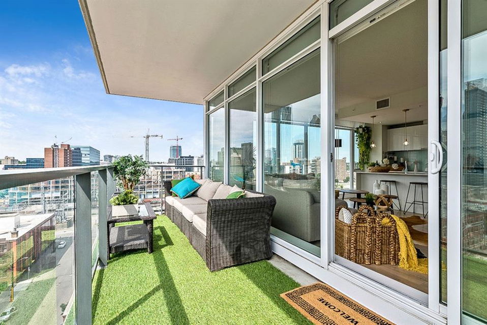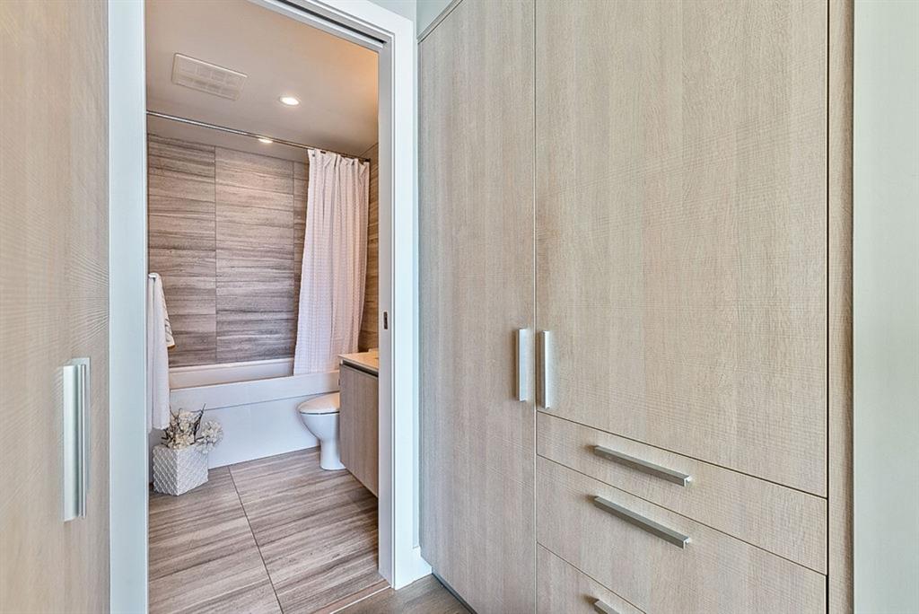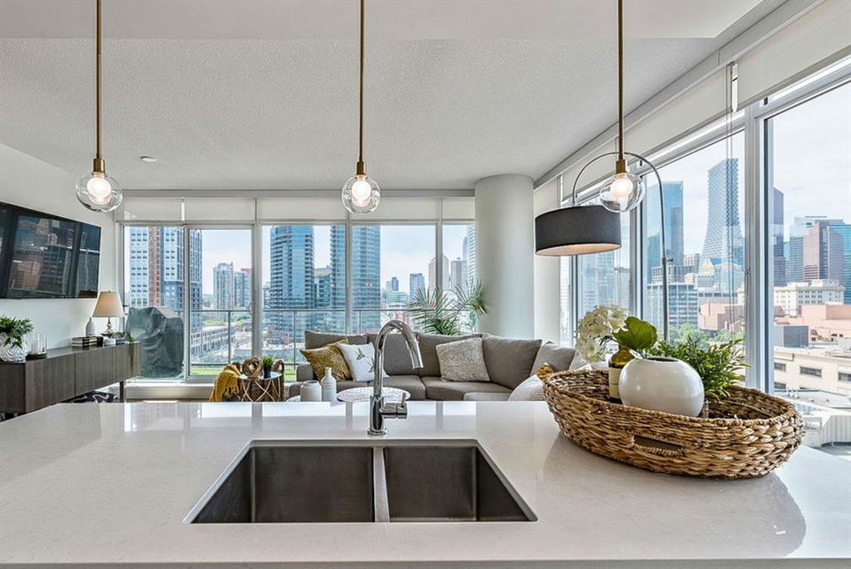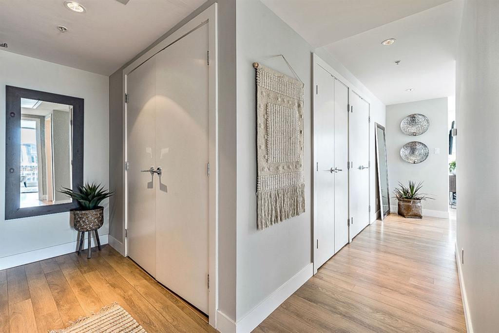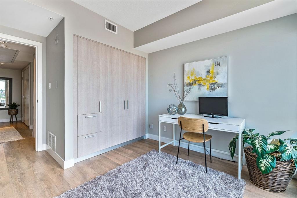 **Click 3D for VIRTUAL TOUR** –> STUNNING, CONTEMPORARY & LUXURIOUS 884SQ.FT CORNER UNIT w 2 BDRM 2BATH on the tenth floor of one of the newest residential high-rises in the heart of urban YYC! With FLOOR-TO-CEILING WINDOWS, CITY/MOUNTAIN VIEWS, and exquisite finishing throughout, this unit clearly exudes elegance, sophistication & style. Offers extensive upgrades with light laminate flooring, CUSTOM BUILT-IN CLOSETS, travertine tile, large chef’s kitchen with European appliances, quartz countertop & island. Open concept living room is wrapped with floor-to-ceiling glass and features views of mountains & YYC skyline all around. Master bedroom offers over-sized windows, walk-through custom closet and ensuite bathroom. Second bedroom or home office, private balcony, second bathroom, in-suite laundry, additional storage closets, PLUS TITLED DOUBLE INDOOR PARKING complete this unit. The building has great amenities incl/concierge service, 24 hour security, visitor parking, gym, yoga studio, residence lounge w/garden terrace for entertaining, bike room & workshop. Located in the heart of urban Calgary, steps from East Village, Stampede Park, Downtown, LRT, New Library, National Music Center, Shopping, Coffee Shops, Restaurants, River Pathways, Inglewood, & more. The Guardian allows for Airbnb. Truly, your options to live, work and play are endless!
