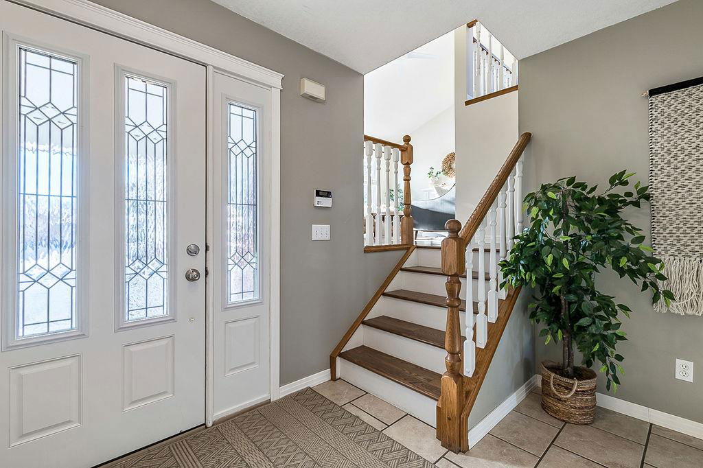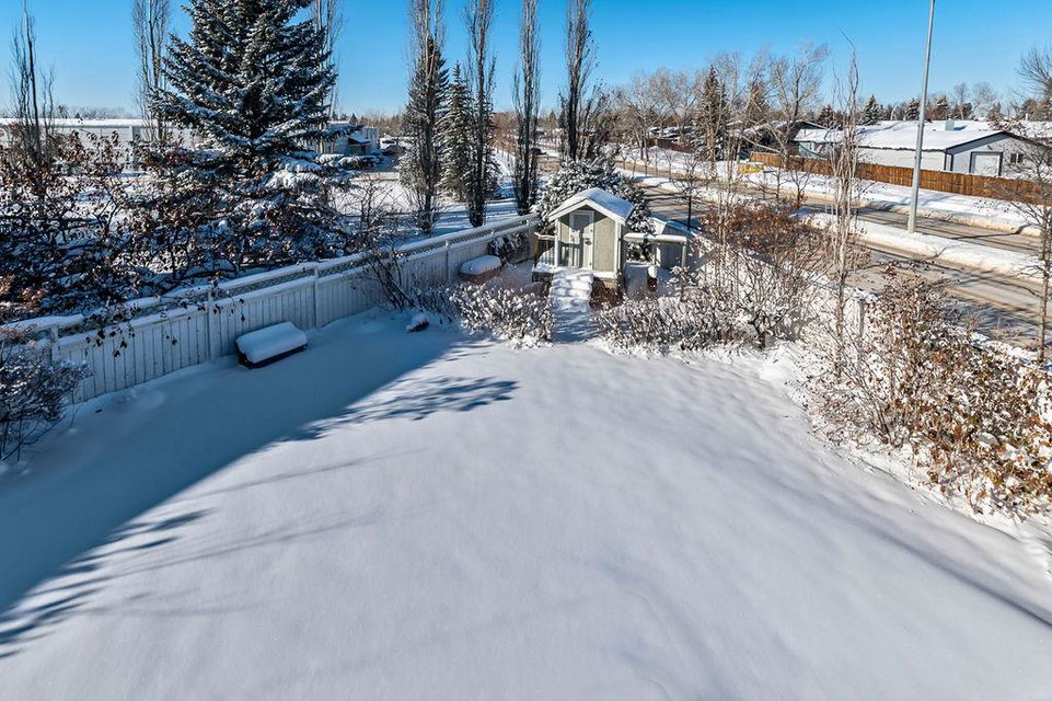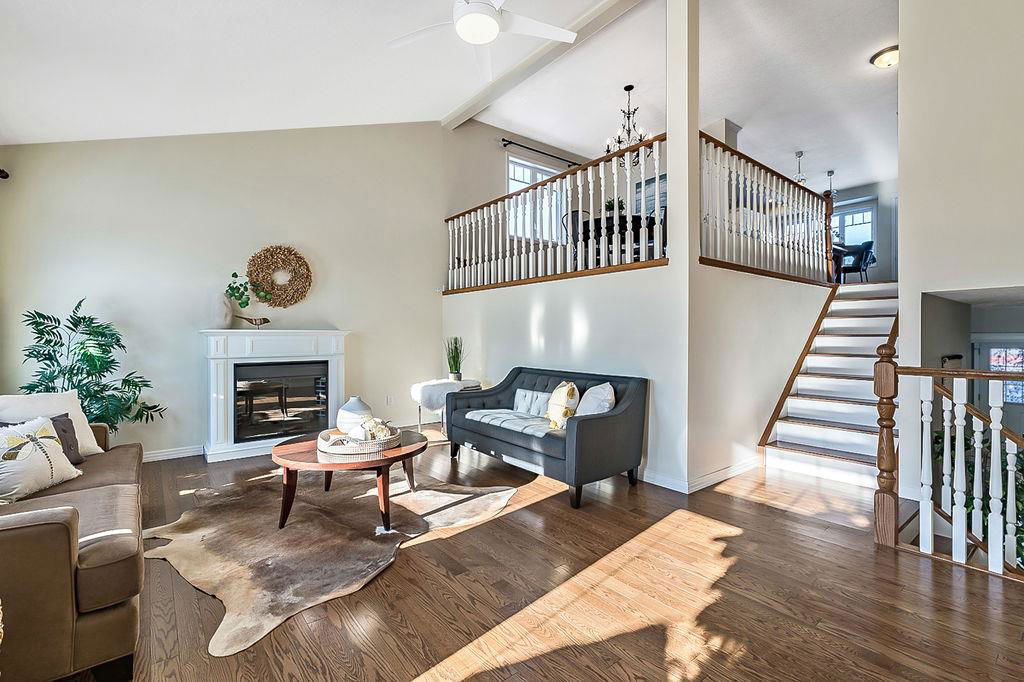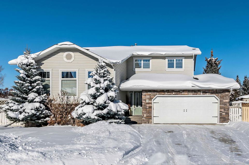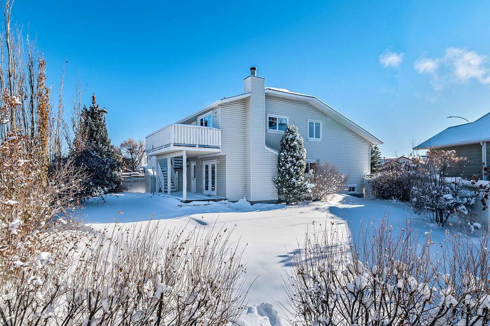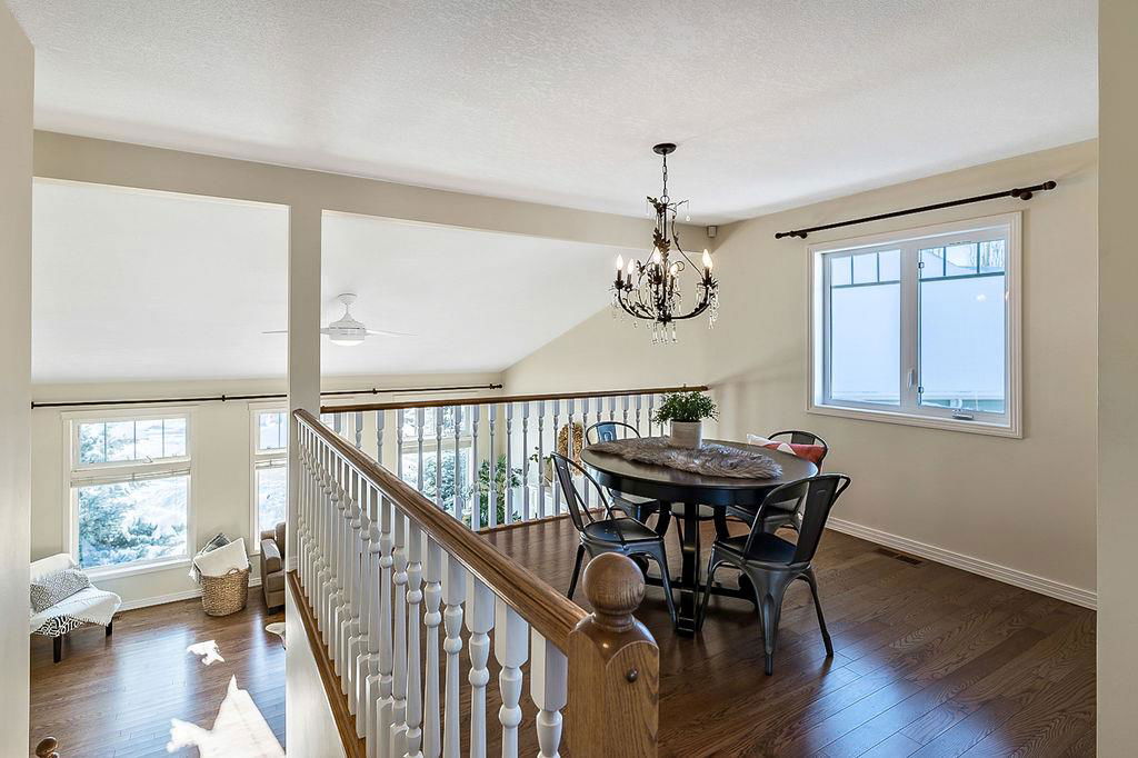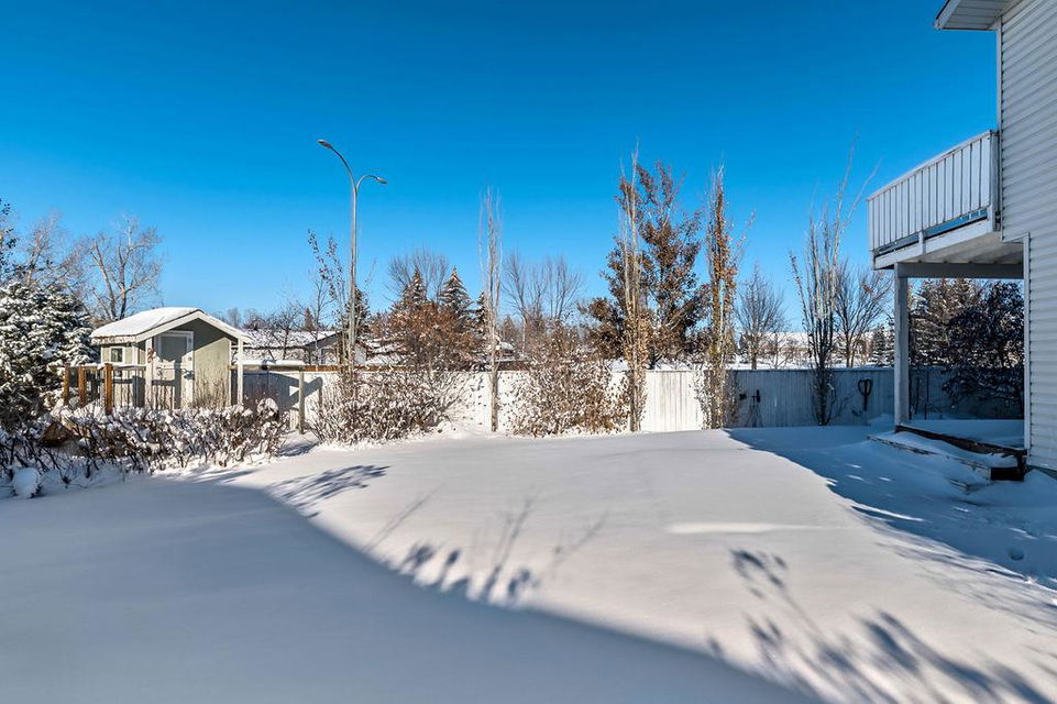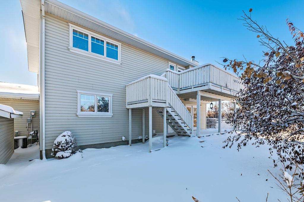 GORGEOUS split level with double attached garage, 2150sq.ft.+ above grade development, VAULTED CEILING, amazing natural light, WHITE KITCHEN plus superb updates throughout … all in the very awesome neighbourhood of Downey, for under $570K! STEP IN (see 3D for walk-through video) and FALL IN LOVE with the warm ambiance and charm of this unique home. Living room is spacious & bright with soaring vaulted ceiling, large windows, and electrical fireplace. Kitchen is elegant & beautiful with white cabinetry and oversized island & eating nook. Separate dining room is perfectly located adjacent to the kitchen & overlooks living room. Home boasts three bedrooms up, including primary bedroom with ensuite and walk-in closet, a fourth bedroom (or study) on main floor, PLUS family room with fireplace and double French doors to back yard. Basement is undeveloped & offers plenty of room for a games room, gym, storage, etc. Back yard is park-like setting and features mature trees and shrubs, shed & more. Home has been meticulously cared for over the years and shows pride of ownership with many improvements: paint (2022), hardwood & carpet (2014), kitchen (2005), siding & doors & windows (2005). This amazing Downey home is just a few minutes walking distance from recreation centre, schools, parks and pathways, close to shopping and amenities, and only 15 minutes from Calgary.