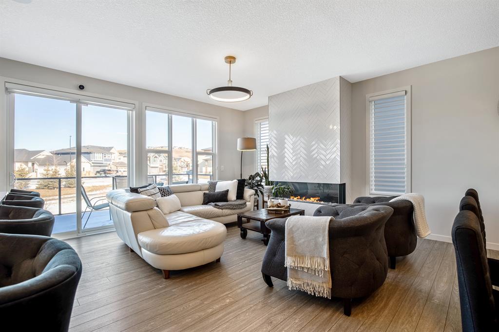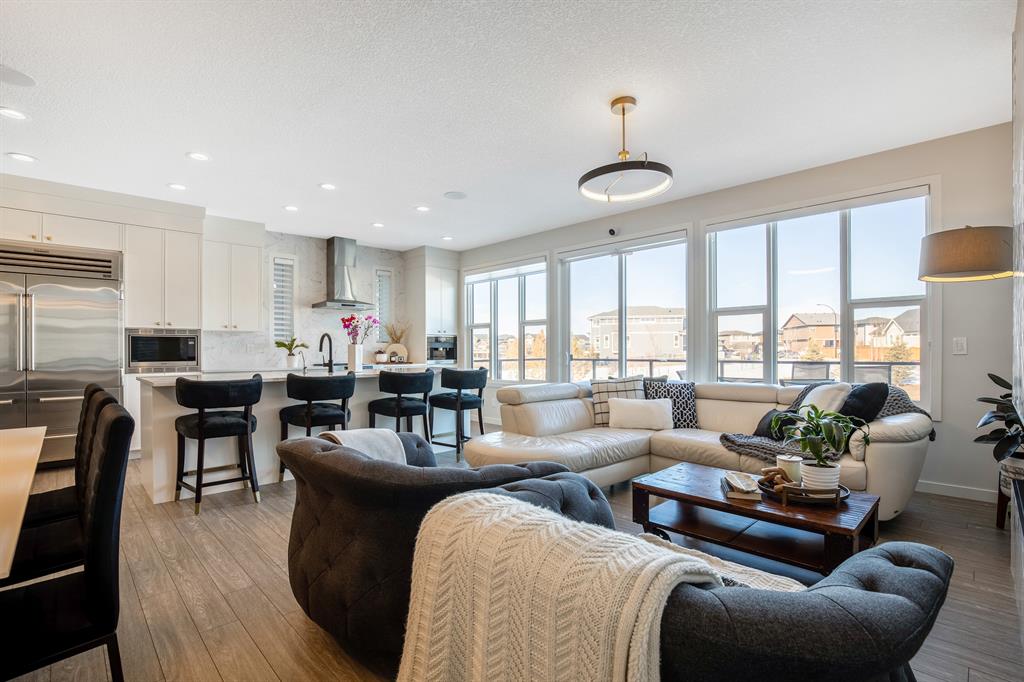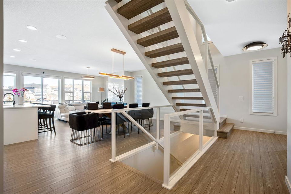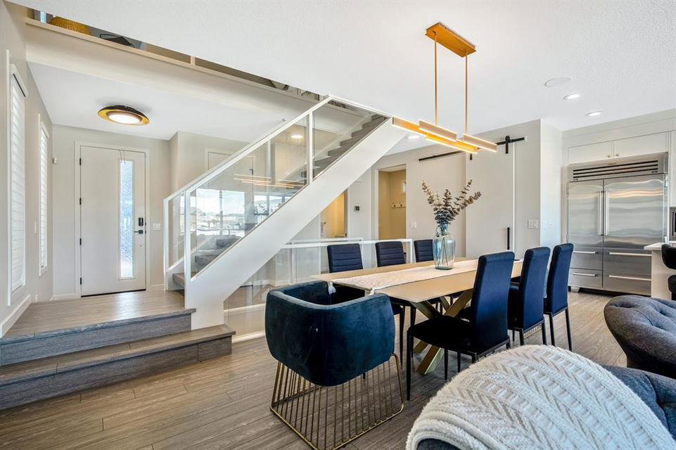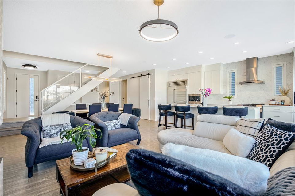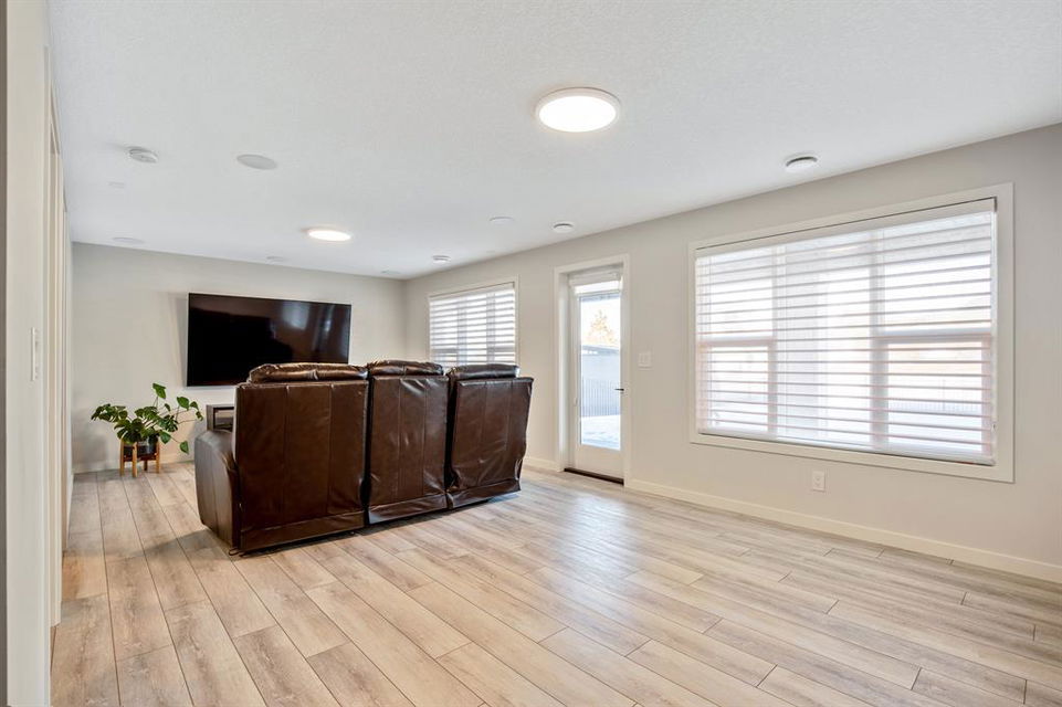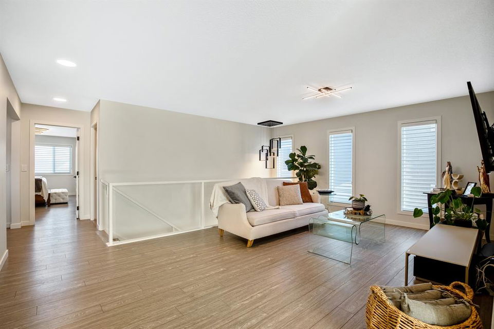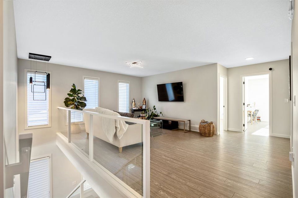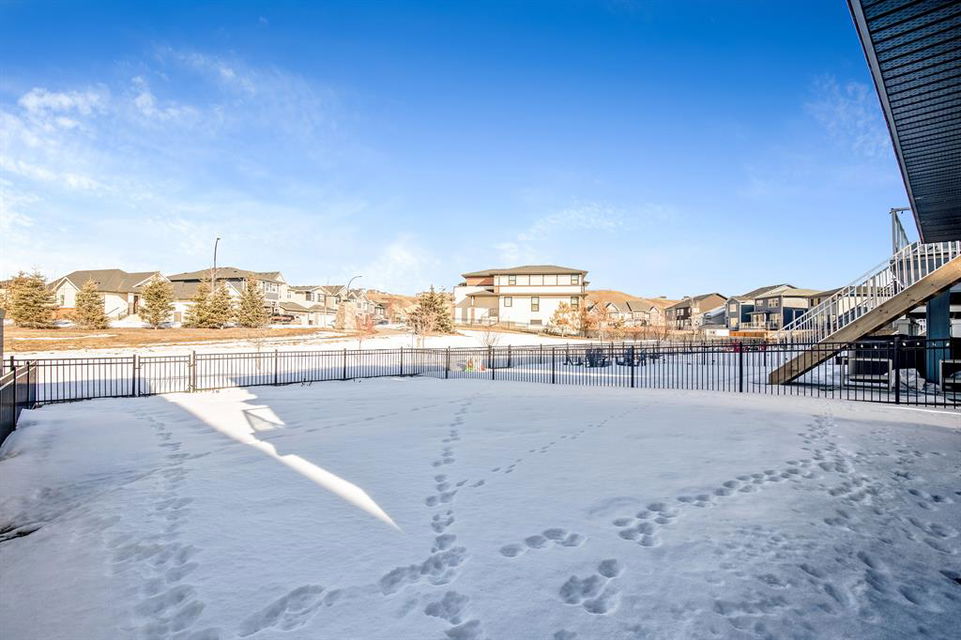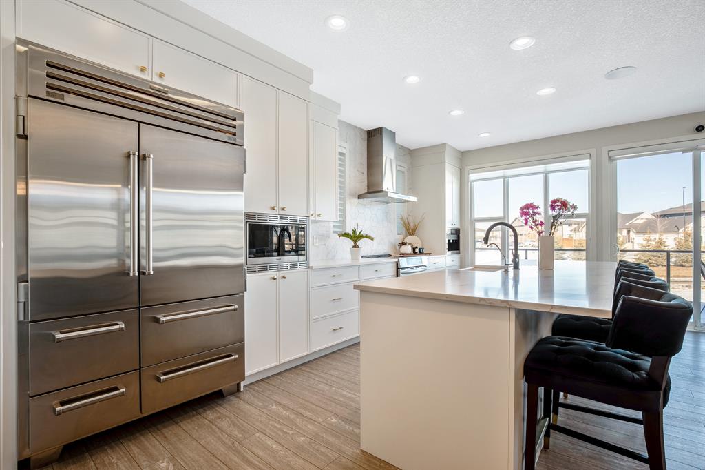 Perfectly situated on a spacious lot that backs onto a green space with a walking path that leads directly to bow river! Upon entering the home, you are greeted by 9’ ceilings & a beautiful open riser staircase with glass railings. The open-concept main floor offers a spacious dining room, and the floor-to-ceiling tiled fireplace compliments the living room. The kitchen is a chef’s dream! Oversized Sub-Zero fridge, built-in Miele coffee machine, induction stove, stainless steel appliances, quartz counters, full height cabinets, eating bar & large walk-in pantry. The 2pc bathroom & spacious mud room with a built-in bench complete the main floor. Luxury laminate flooring flows throughout all three levels. Upstairs is home to a centred bonus room, desk nook & convenient upper laundry. The master retreat features dual walk-in closets with organizers & a 5pc ensuite that includes double sinks, quartz counters, a water closet & a massive shower with 10mm glass, a hidden niche, a rainfall shower head & wand. The two additional bedrooms on the upper floor are spacious, with walk-in closets. The guest bathroom is uniquely designed with a pocket door that separates the dual sinks & shower/toilet. Perfect for siblings in the morning! The fully finished walkout basement was completed by the Builder (Cedarglen) and comes complete with a 4th bedroom, 4pc bathroom, family room & storage. Enjoy entertaining on the spacious upper deck that overlooks the professionally landscaped yard and features a glass railing and gas line for an optional BBQ or heater. The covered stamped concrete patio is the perfect place to escape the sun in the summer months. The garage is insulated/drywalled & features an electric car charging station. Additional upgrades to note are central AC, upgraded light fixtures throughout, black hardware/faucets & built-in speakers. Enjoy quick access to multiple walking trails, bow river, amenities & playgrounds.