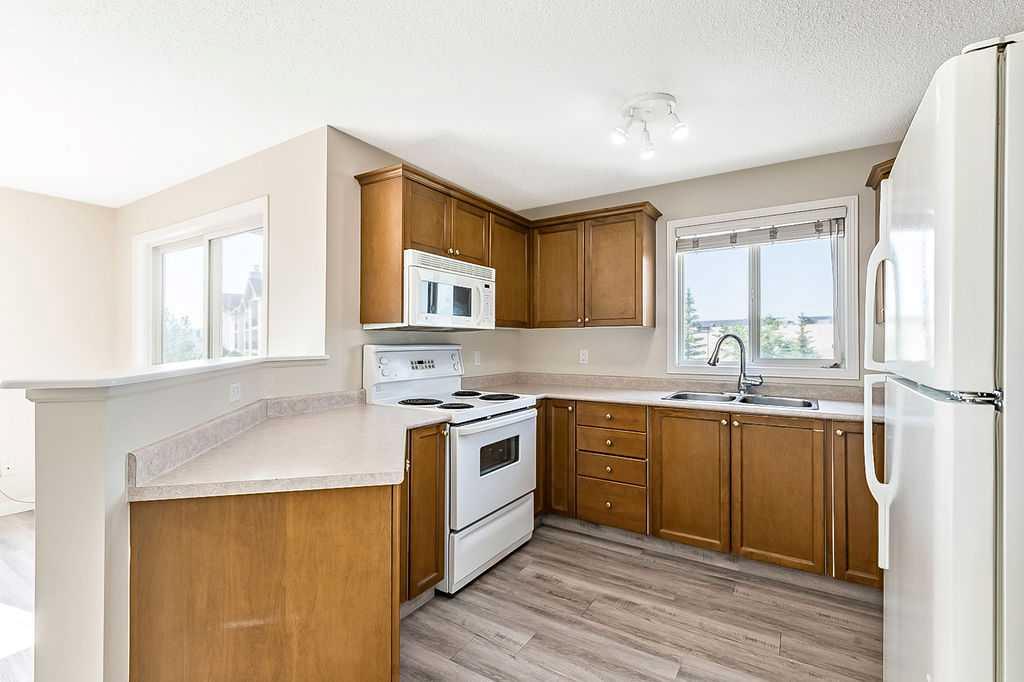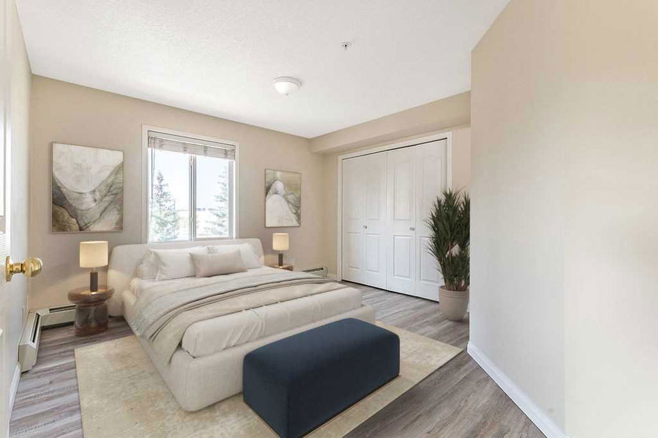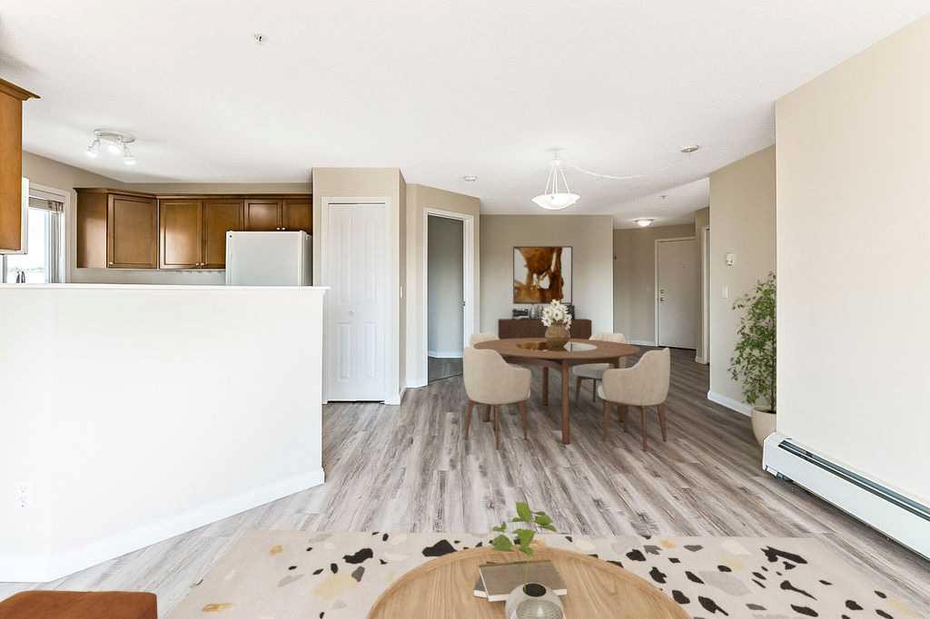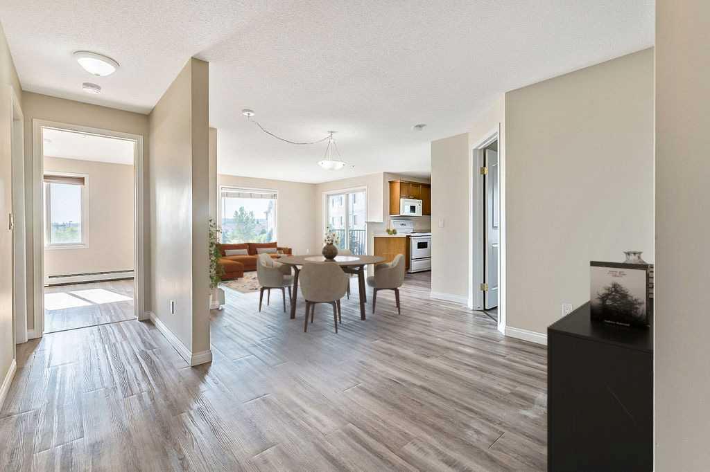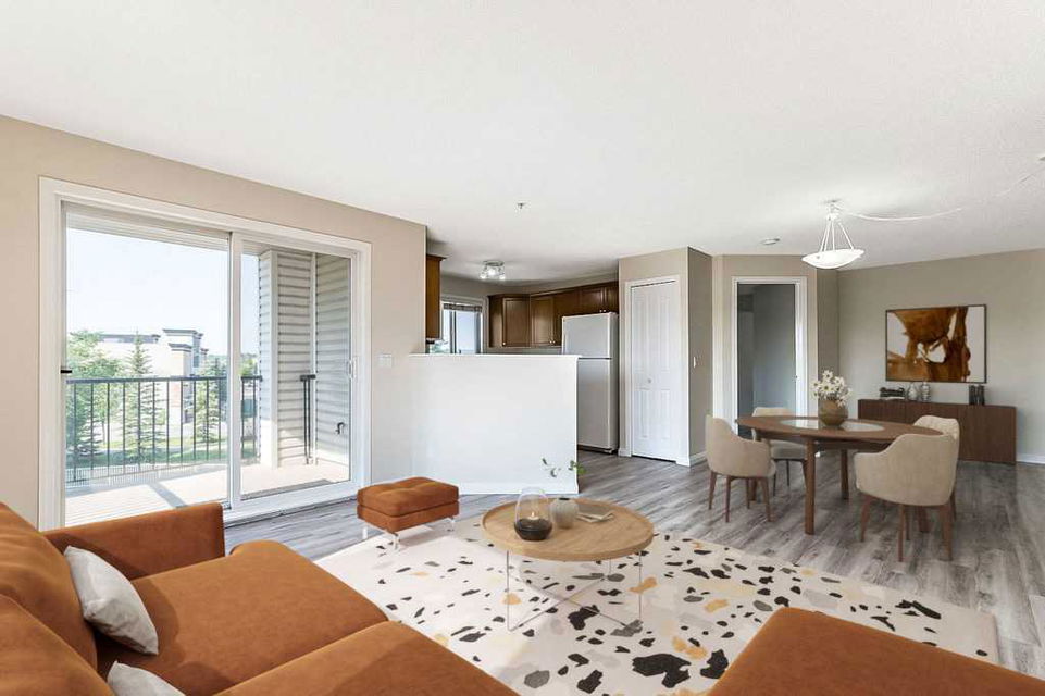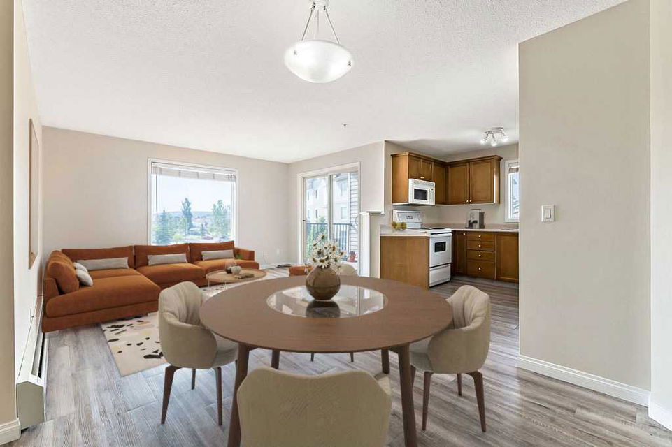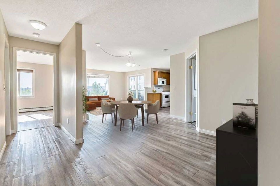 SUNNY & GORGEOUS 2bdrm 2 bath third floor CORNER UNIT with large SE balcony and windows all around … truly one of the best units in Cimarron Common! Step in (click 3D for virtual walkthrough), and you will immediately be welcomed by spacious entryway, large open concept living room and dining area, plus kitchen with ample counter & cupboard space! Large primary bedroom offers deep closet and comfortable 4pc ensuite bathroom. Second bedroom and second full bathroom, together with in-suite laundry, and large balcony with gas line for BBQ complete the unit. The assigned outdoor parking stall is conveniently located right in front of the entrance door (#110). Condo fees include heat, electricity, insurance, water, common area maintenance, professional management & reserve fund. Building is well run, board is easy to communicate with, and furry friends are welcome with some restrictions upon pet approval. Location, location, location … yes, it’s simply superb with shopping, schools, parks, restaurants, medical centre & more just steps away! Unit is move-in ready with quick possession possibility.