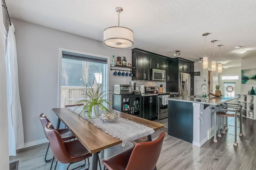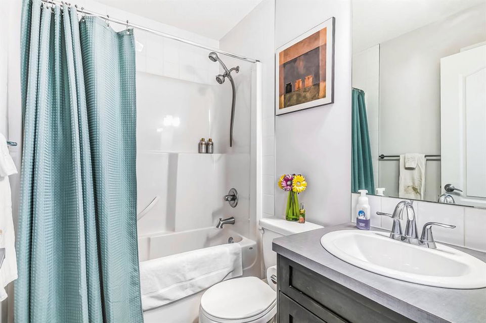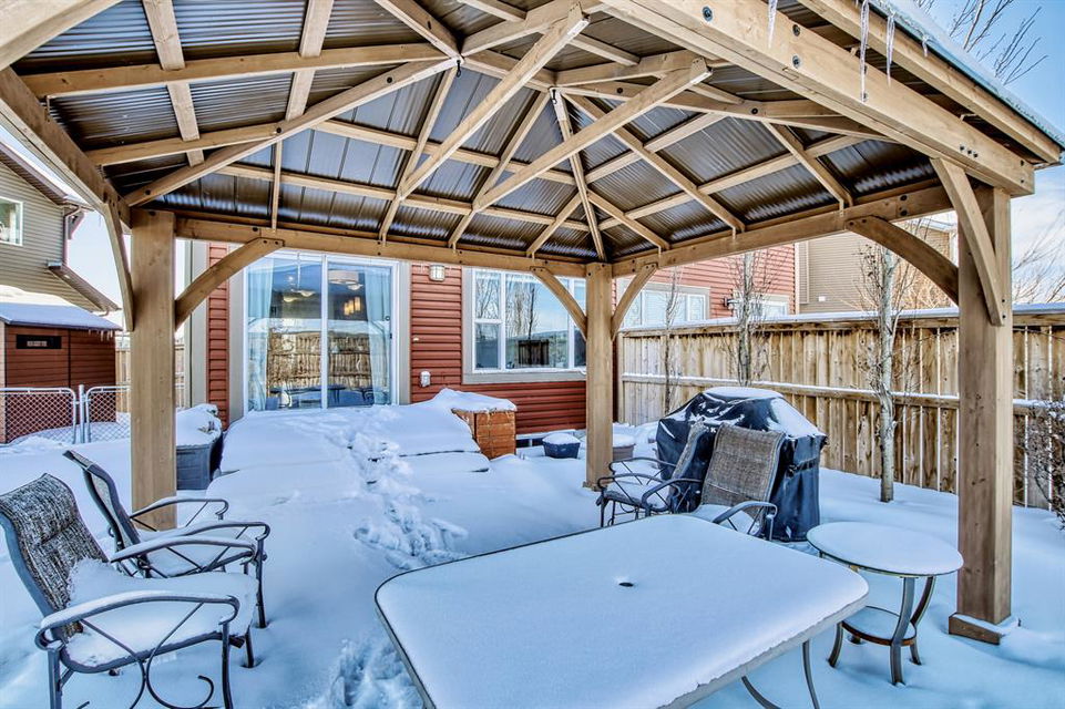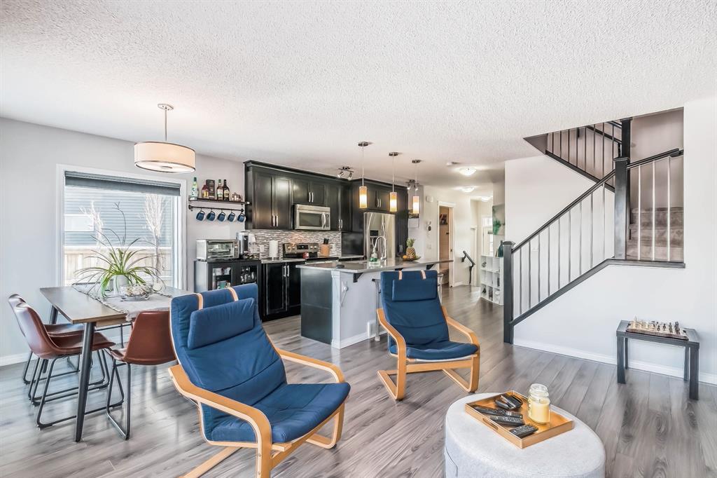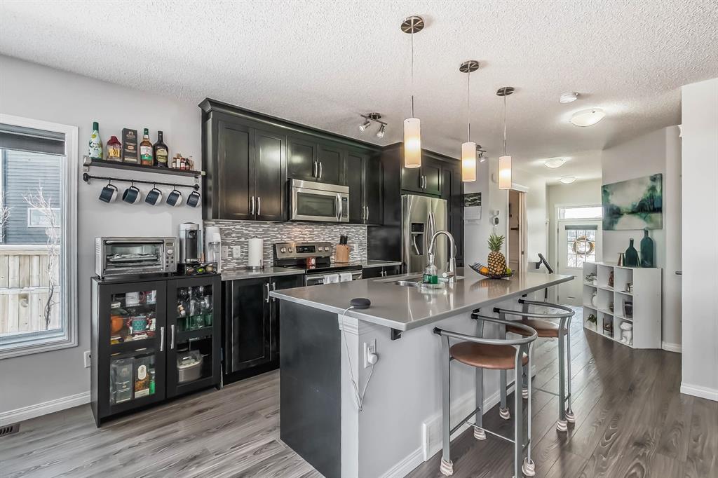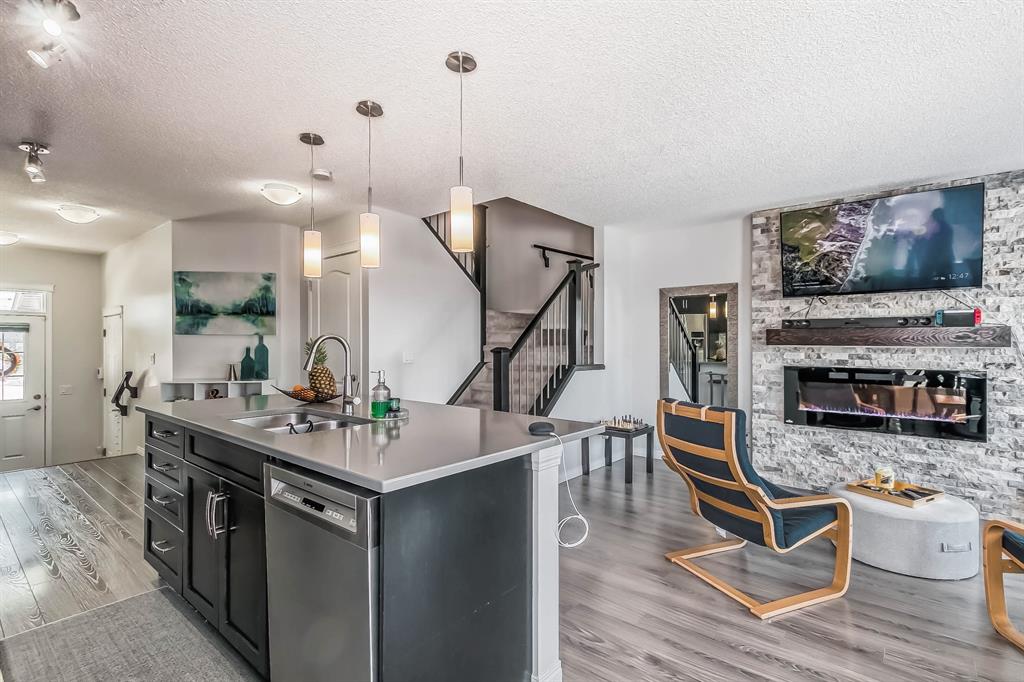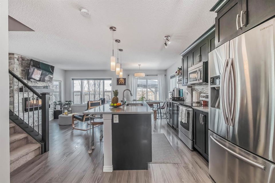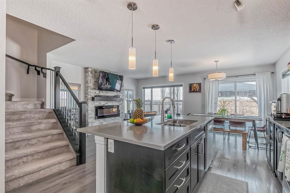 Open house this Saturday, March 11 from 2-4 p.m. Welcome to this gorgeous semi-detached home located in the desirable lake community of Auburn Bay, with a front attached garage that has 220v electrical outlet for electric car charger. The home is situated in a cul-de-sac and backs onto a green space/Auburn Dog Park with the views of the city and mountains. The main level features an open living area with a electrical fireplace and media components wired in for a wall-mounted TV system. The functional kitchen features upgraded ceiling height cabinets, quartz countertops, stainless steel appliances, and a breakfast bar. The adjacent dining area leads you to the northwest facing backyard. The second floor of the home features a master bedroom with a 4-piece ensuite and a walk-in closet, a laundry room with a window, a main bathroom, and two additional bedrooms. The open railing in the stairwell adds a modern touch to the home’s design. The basement is fully finished and includes a family room and a 3-piece bathroom, providing additional living space for your family. The backyard of this home is simply stunning, beautiful landscaping with flower beds, trees and a 12’x14′ gazebo. It is the perfect spot for enjoying the warm summer days and evenings. The location of this home is excellent, close to the Lake, South Calgary Hospital, YMCA, shops, restaurants, and more. Overall, this is a fantastic opportunity to own a beautiful home in a desirable location.