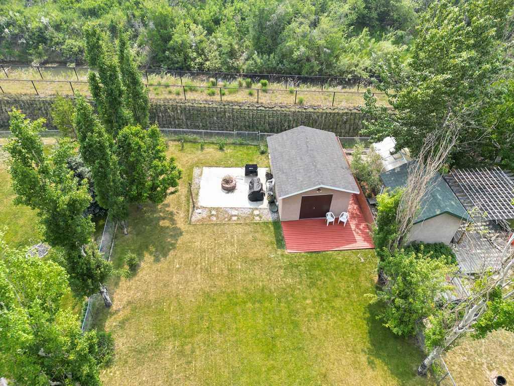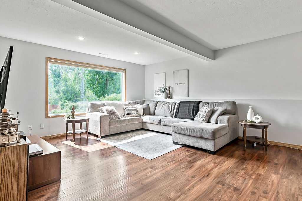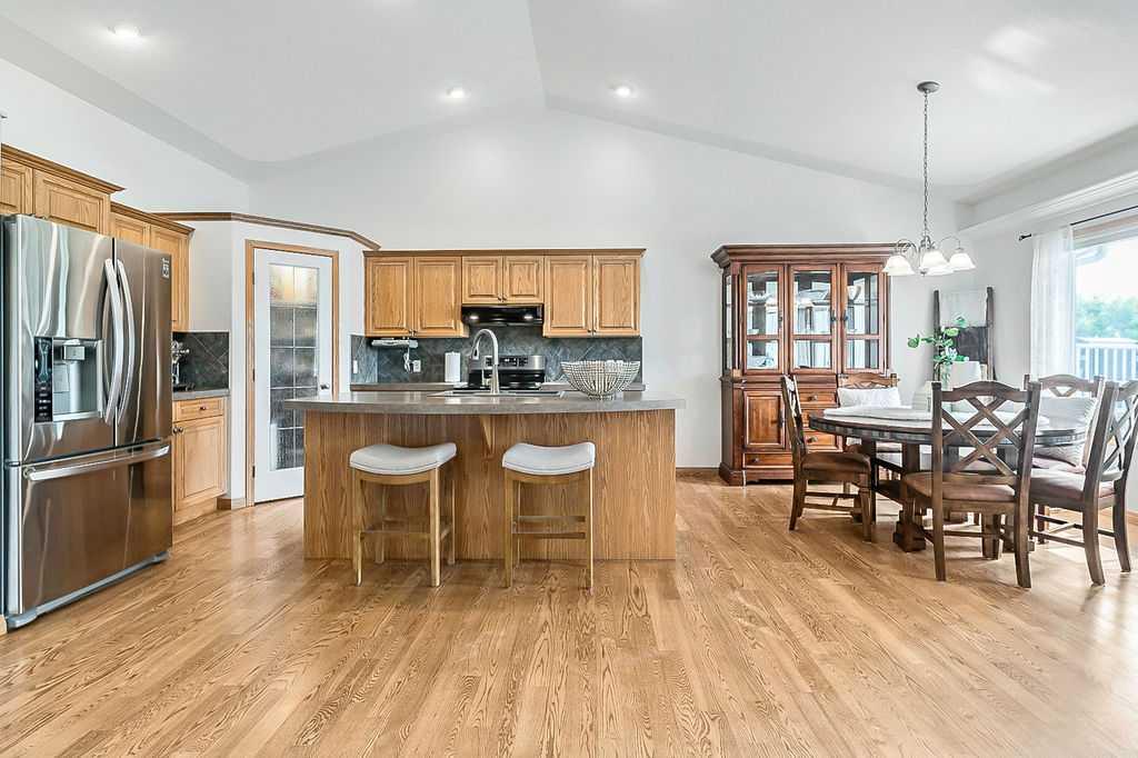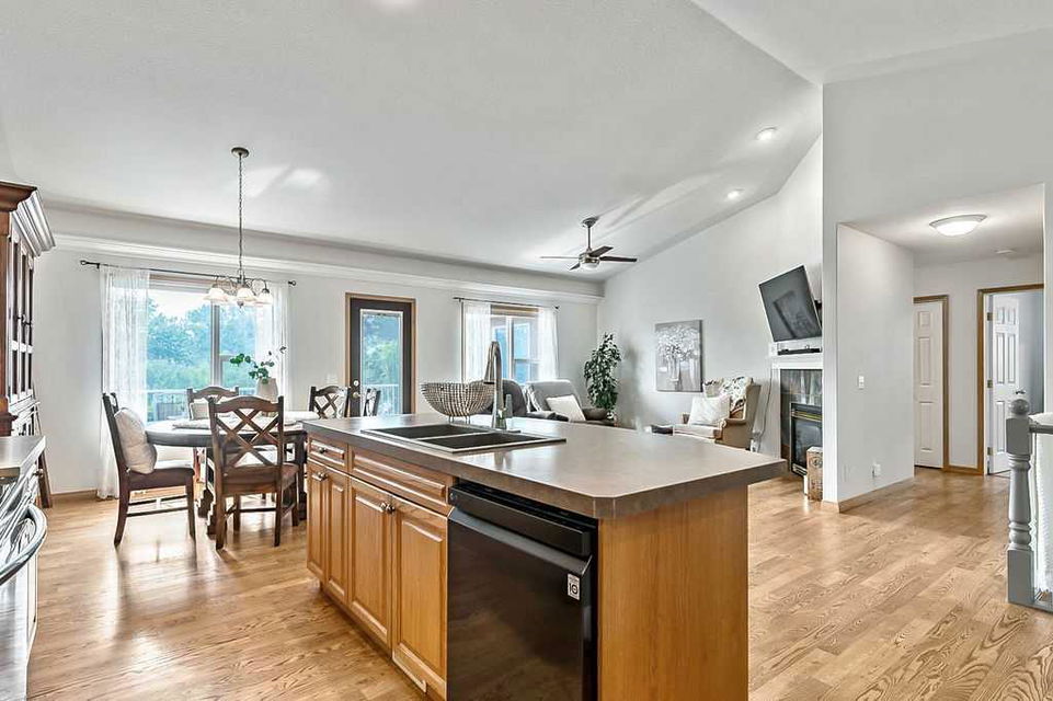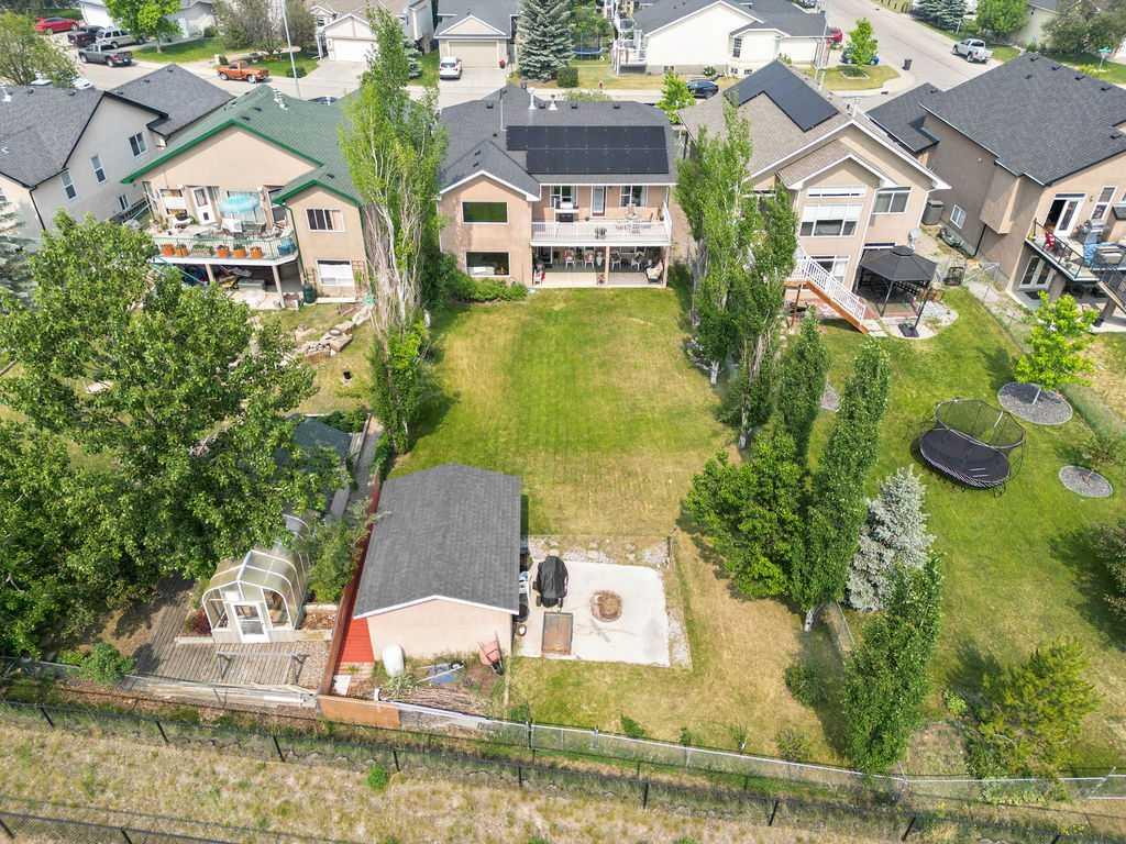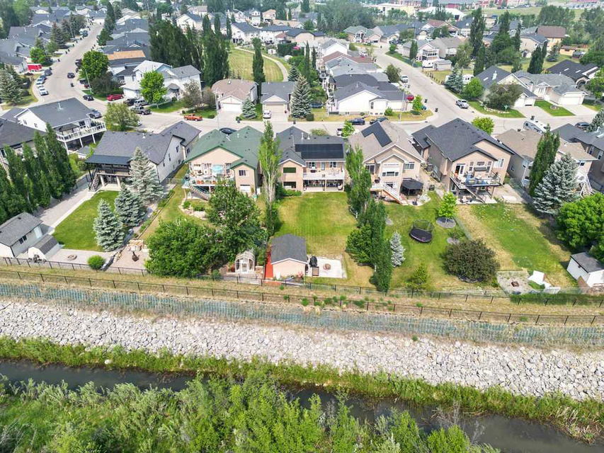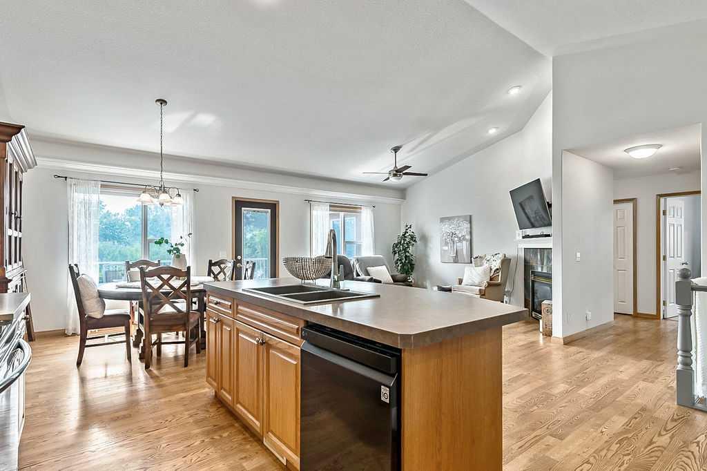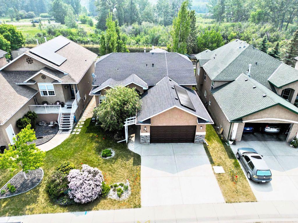 GORGEOUS OVERSIZED LOT BACKING ONTO NATURAL DISTRICT, VAULTED CEILING, open concept plan with 2700SQFT+ of living area, five bedrooms, main floor den, WALK-OUT BASEMENT … truly, this bilevel bungalow checks them all! Step inside (click 3D for virtual walkthrough), and you will fall in love with this home’s warm ambiance and beautiful setting. MAIN LEVEL features stunning open concept kitchen with pantry and island, living room with corner fireplace, dining area overlooking back yard, primary bedroom with ensuite bathroom and walk-in closet, and second bedroom plus full bathroom. ENTRY LEVEL a few steps down features home office to one side. LOWER LEVEL features spacious layout, huge windows that flood this space with natural light, in-floor heating, large recreation room, three more bedrooms and full bathroom. All in, this home offers an impressive 5 bedrooms, 1 den, plus 3 full bathrooms. OVERSIZED (21’3” x 24’0”) DOUBLE GARAGE is insulated, drywalled and heated (gas). THEN THERE IS THIS HOME’S BACK YARD PARADISE … oh my, truly a private oasis within a nature reserve, and nearly double the size of most lots in town. Lot backs onto designated natural area and offers plenty of room and privacy for endless hours of outdoor relaxation and fun in the summer, and room for skating rink in winter. Did we mention AC, solar panels that have essentially eliminated electric bills for sellers, and new hot water tank? If you are looking for a spacious bungalow in perfect serene setting, then this is the one!! RECENT UPDATES: solar panels $26K (2024), new hot water heater $5K (2024), new paint throughout (2025)