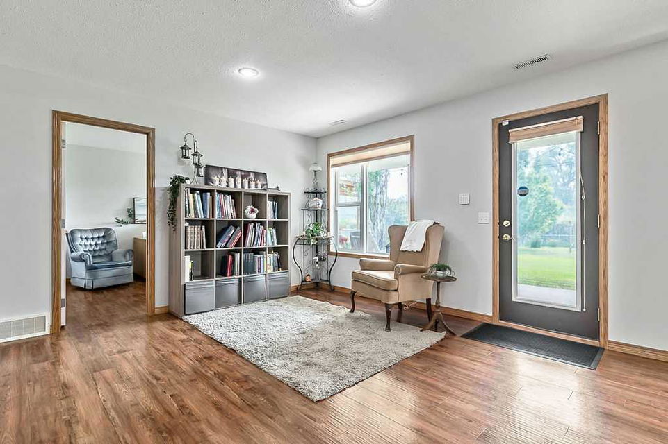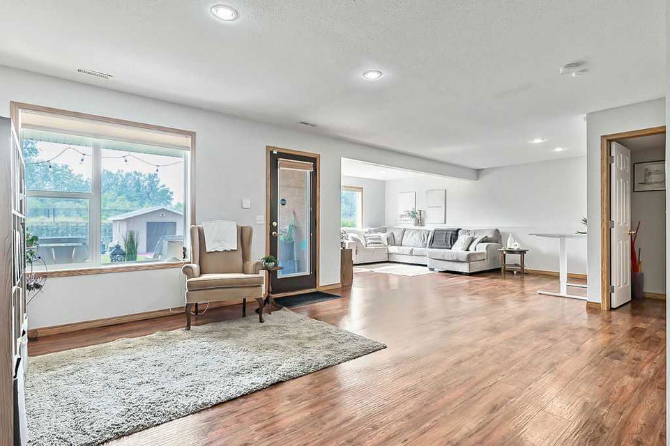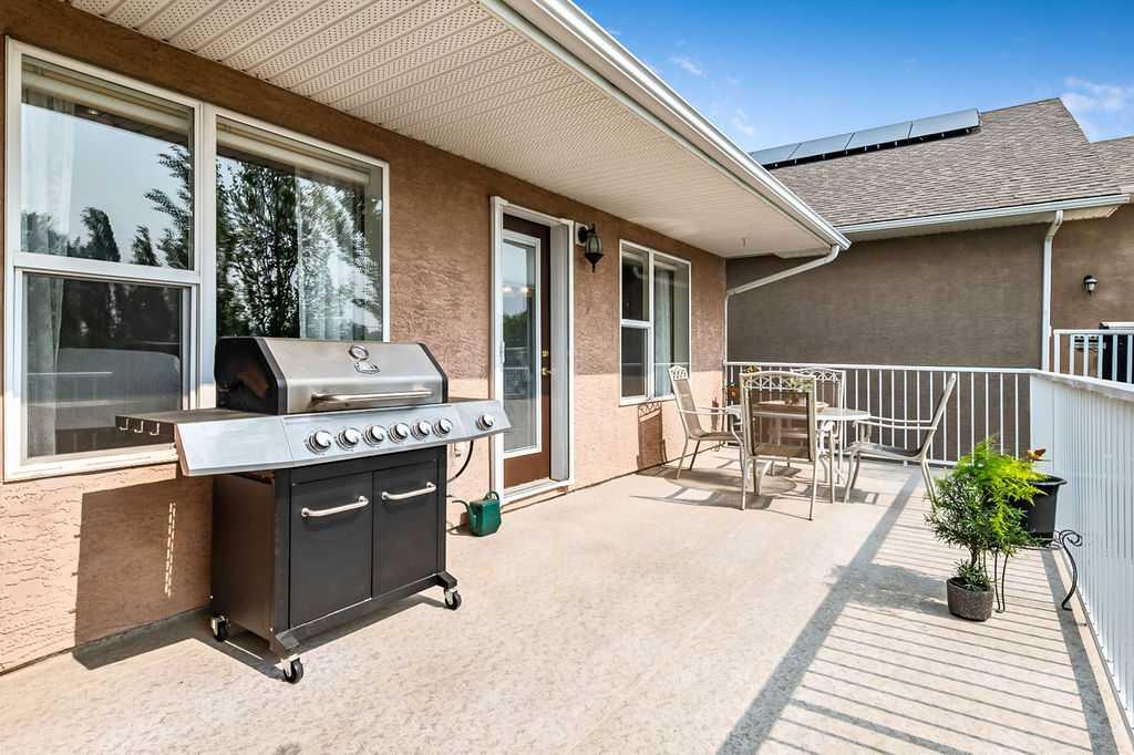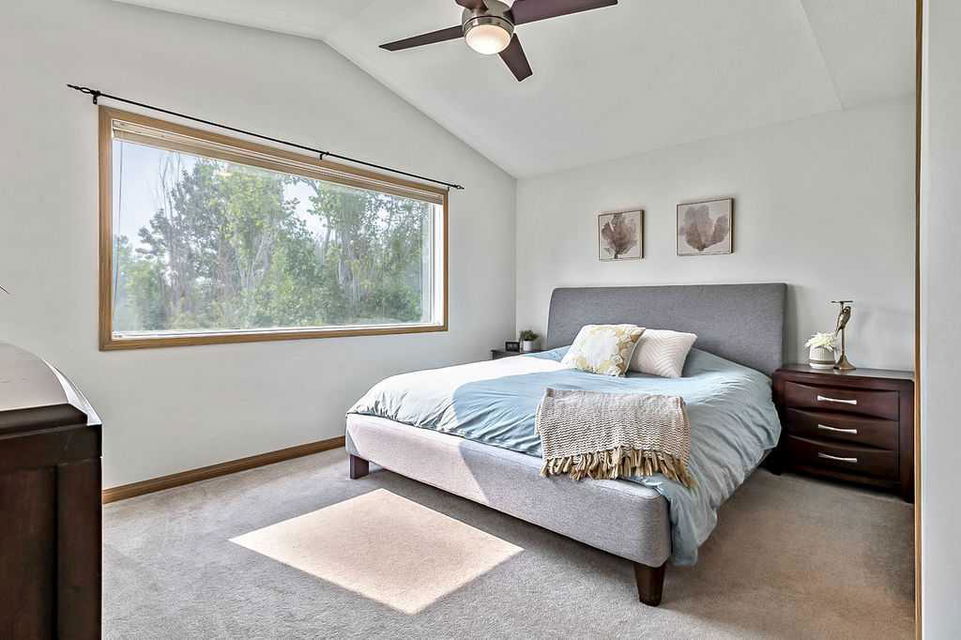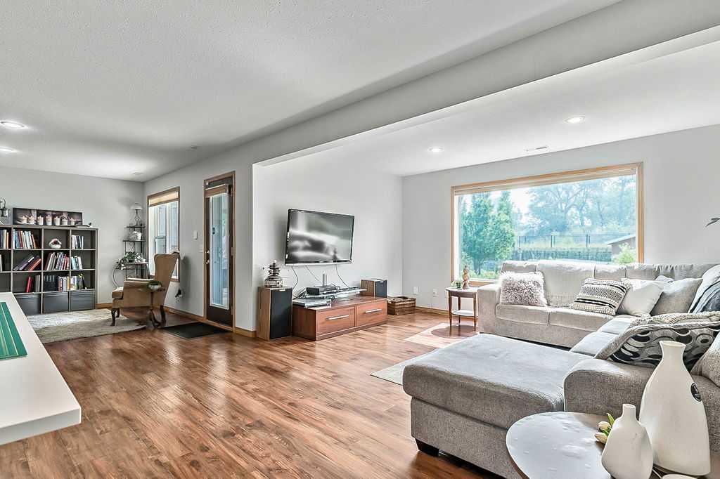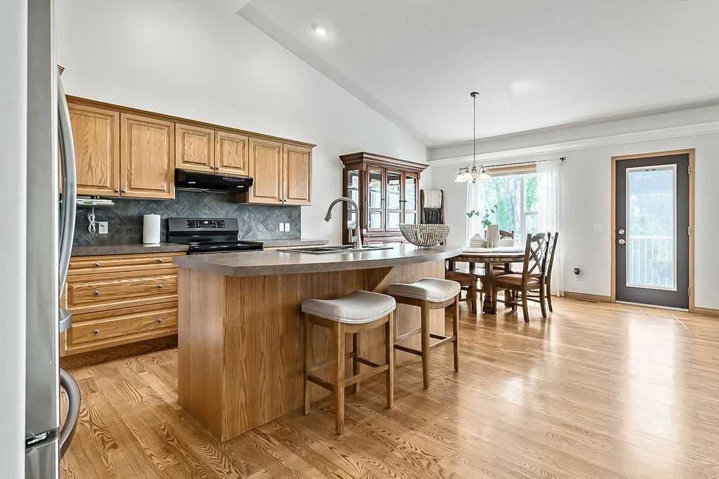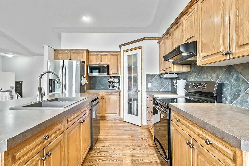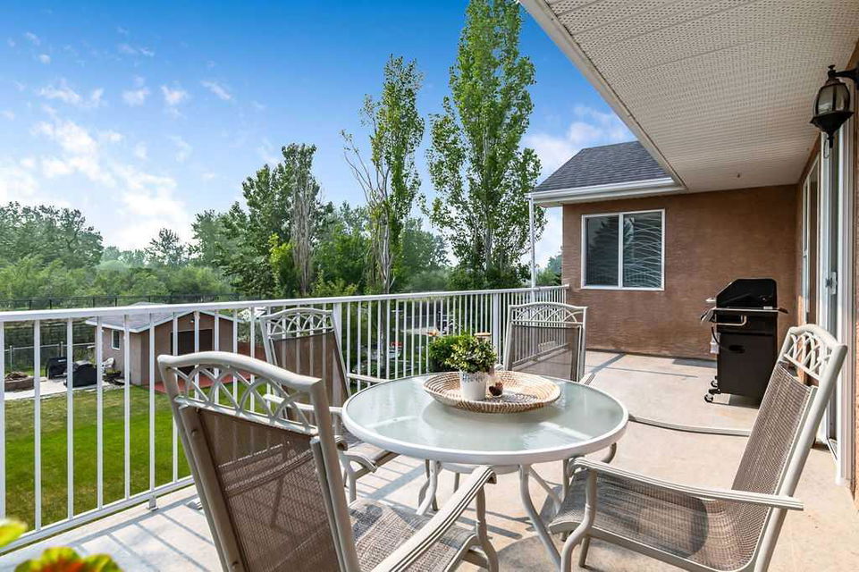 GORGEOUS OVERSIZED LOT BACKING ONTO NATURAL DISTRICT, VAULTED CEILING, open concept plan with 2700SQFT+ of living area, five bedrooms, main floor den, WALK-OUT BASEMENT … truly, this bilevel bungalow checks them all! Step inside (click 3D for virtual walkthrough), and you will fall in love with this home’s warm ambiance and beautiful setting. MAIN LEVEL features stunning open concept kitchen with pantry and island, living room with corner fireplace, dining area overlooking back yard, primary bedroom with ensuite bathroom and walk-in closet, and second bedroom plus full bathroom. ENTRY LEVEL a few steps down features home office to one side. LOWER LEVEL features spacious layout, huge windows that flood this space with natural light, in-floor heating, large recreation room, three more bedrooms and full bathroom. All in, this home offers an impressive 5 bedrooms, 1 den, plus 3 full bathrooms. OVERSIZED (21’3” x 24’0”) DOUBLE GARAGE is insulated, drywalled and heated (gas). THEN THERE IS THIS HOME’S BACK YARD PARADISE … oh my, truly a private oasis within a nature reserve, and nearly double the size of most lots in town. Lot backs onto designated natural area and offers plenty of room and privacy for endless hours of outdoor relaxation and fun in the summer, and room for skating rink in winter. Did we mention AC, solar panels that have essentially eliminated electric bills for sellers, and new hot water tank? If you are looking for a spacious bungalow in perfect serene setting, then this is the one!! RECENT UPDATES: solar panels $26K (2024), new hot water heater $5K (2024), new paint throughout (2025)