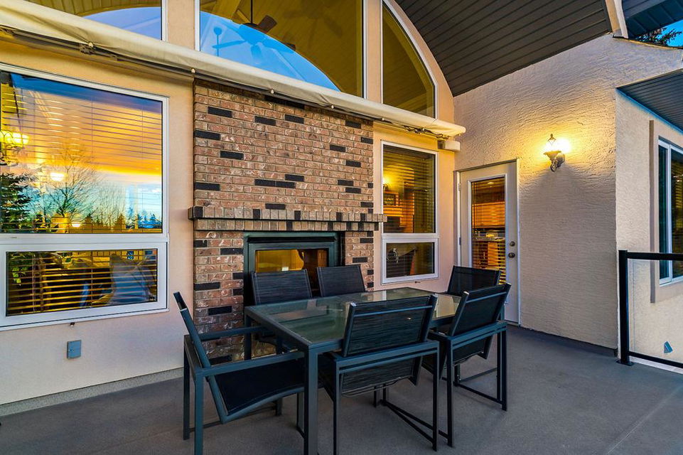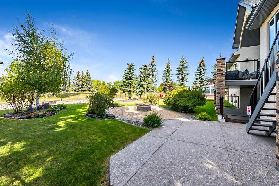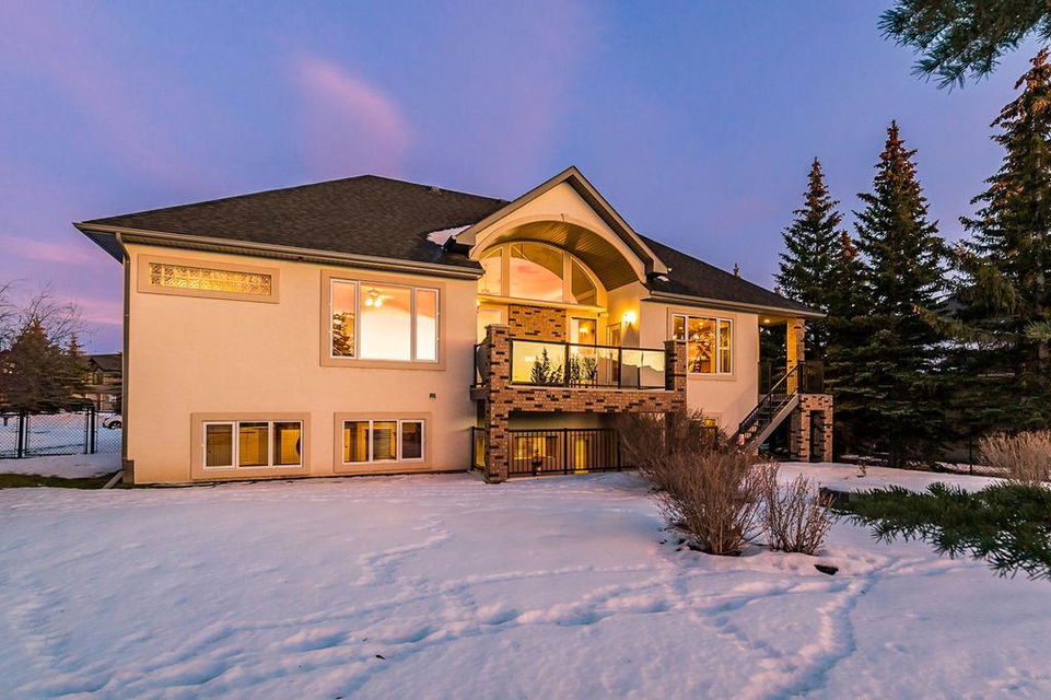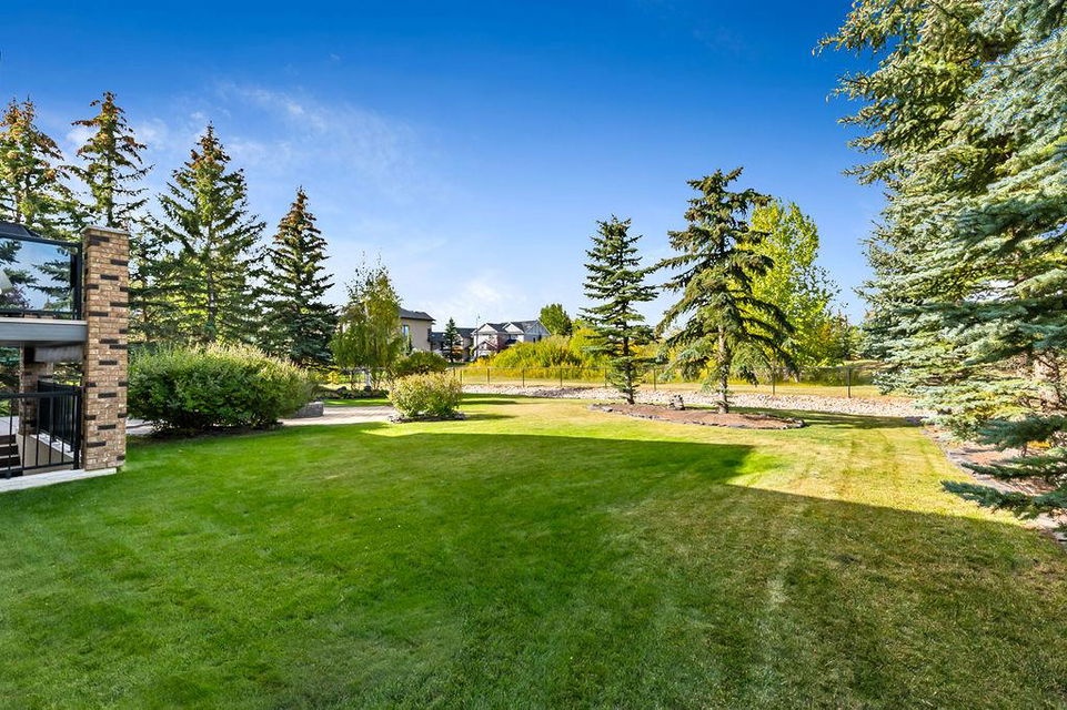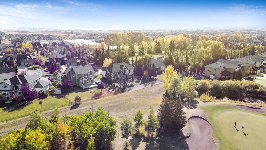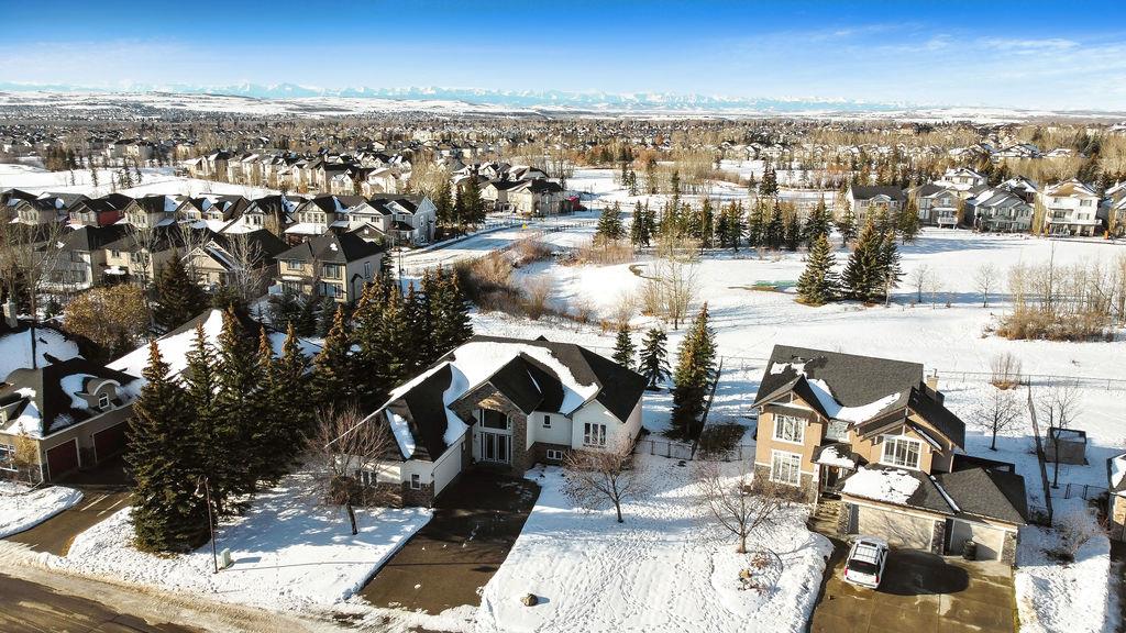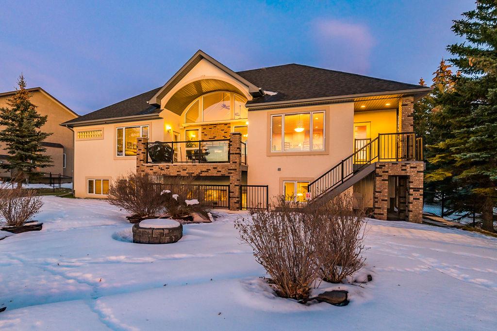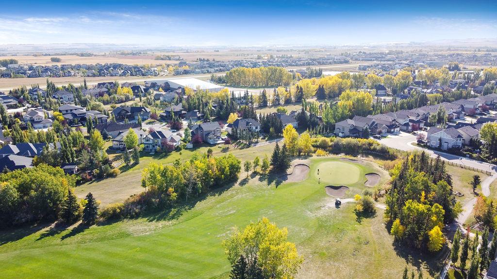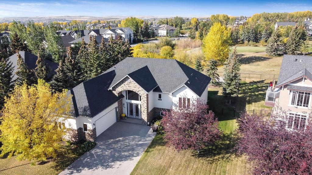LUXURIOUS FORMER AIR RANCH SHOWHOME with superb layout, HUGE 1/3 ACRE LOT, AMAZING GOLF COURSE LOCATION … 2BDRMS up & 2BDRMS down, WEST yard, PLUS MOUNTAIN VIEWS! **Click 3D video for virtual walk-through**. MAIN floor features 1940sq.ft.+ space with large living room w two-way fire-place & vaulted ceiling, gourmet kitchen with custom maple cabinetry, large island & walk-in pantry, and superb dining with windows overlooking yard. Spacious owner’s suite boasts gorgeous ensuite bath with STEAM shower with 11 shower heads, soaker tub, walk-in closet, and double sink vanity. Main floor also features large den (or second bedroom), another full bathroom, and generous laundry room. Brazilian hardwood & slate floors throughout. LOWER level offers 1600sq.ft.+ more space, 11’ ceilings, family room with second fireplace, games room with custom bar & built-in TV’s, and two more bedrooms with full bathroom. IN-FLOOR HEAT, two furnaces, AC, smart wiring & sound surround throughout the house. GORGEOUS 170’ x 85’ YARD is beautifully landscaped with mature vegetation, irrigation system, concrete patio area, and spacious deck … and offers views of golf course & Rocky Mountains. PLUS OVERSIZED 22’x33’ garage, exposed aggregate driveway. If you are looking for luxurious bungalow-style living in a prestigious community, and enjoy golf course & mountain views, then this is it!
