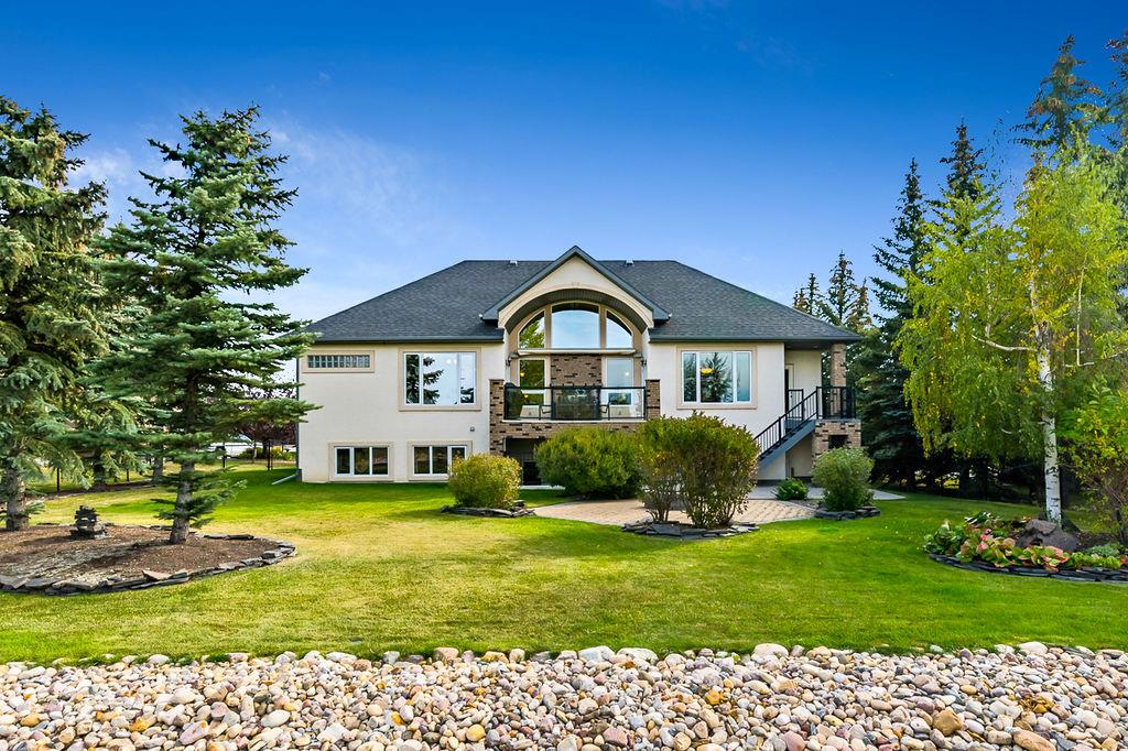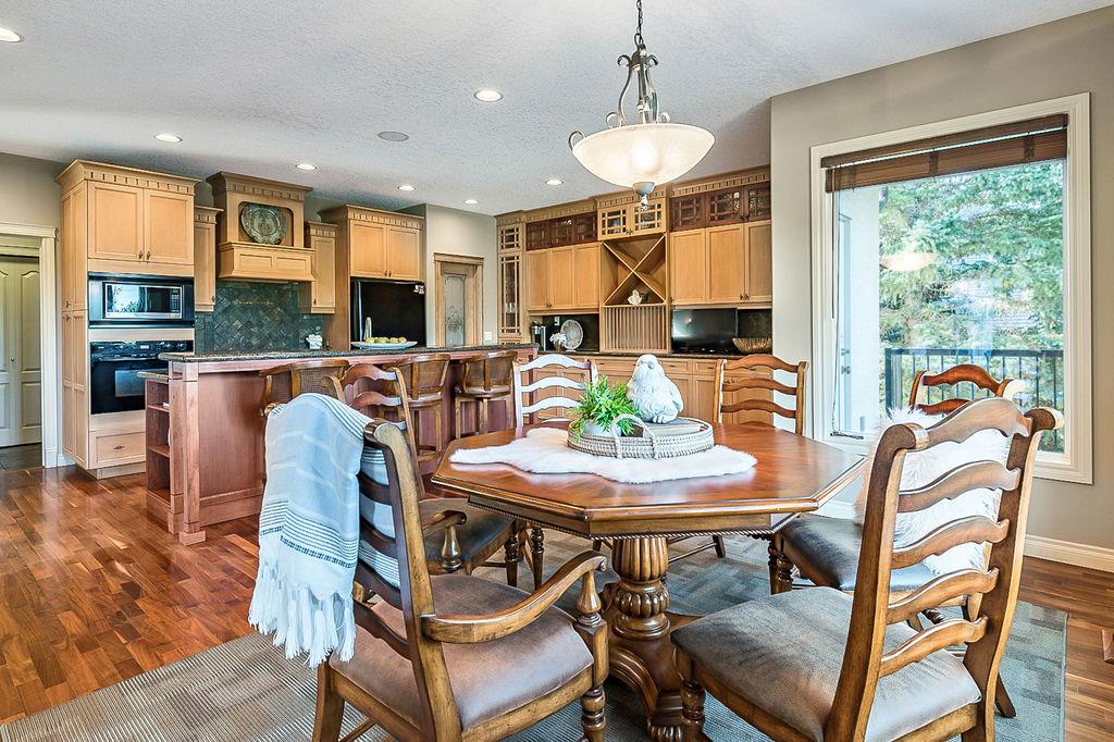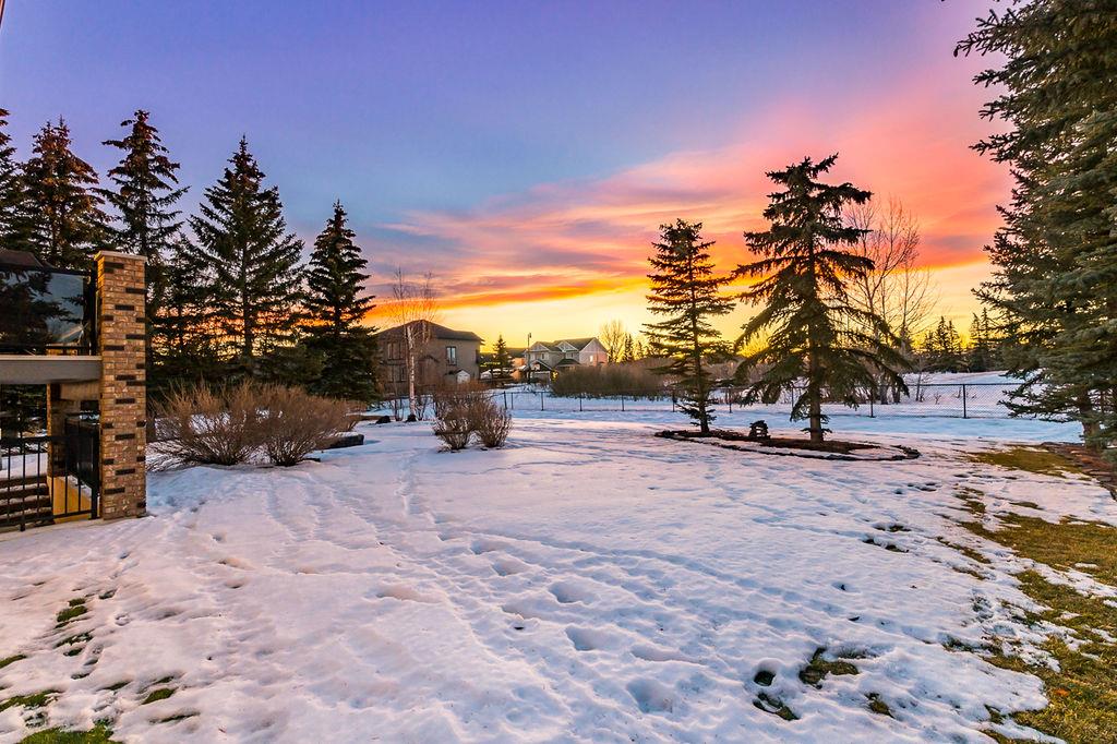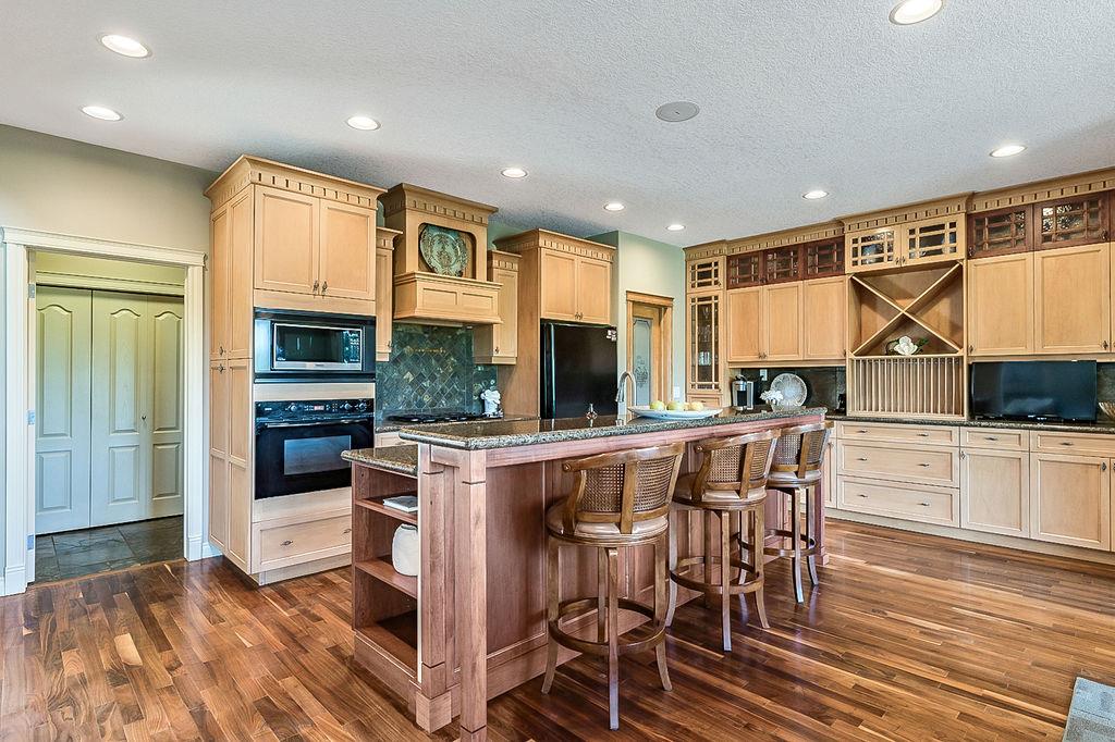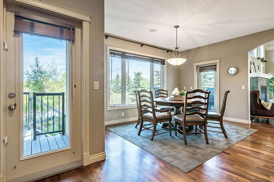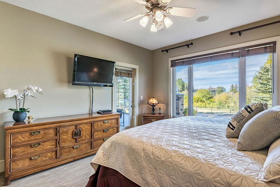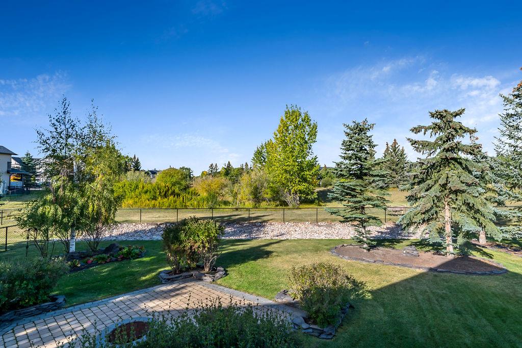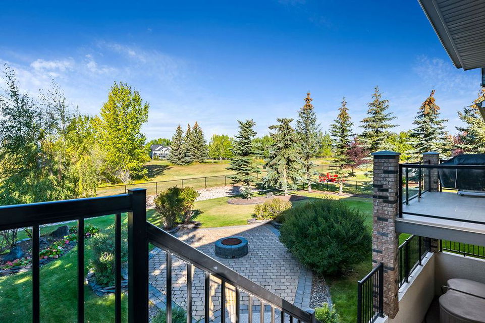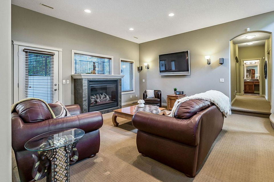 LUXURIOUS FORMER AIR RANCH SHOWHOME with superb layout, HUGE 1/3 ACRE LOT, AMAZING GOLF COURSE LOCATION … 2BDRMS up & 2BDRMS down, WEST yard, PLUS MOUNTAIN VIEWS! **Click 3D video for virtual walk-through**. MAIN floor features 1940sq.ft.+ space with large living room w two-way fire-place & vaulted ceiling, gourmet kitchen with custom maple cabinetry, large island & walk-in pantry, and superb dining with windows overlooking yard. Spacious owner’s suite boasts gorgeous ensuite bath with STEAM shower with 11 shower heads, soaker tub, walk-in closet, and double sink vanity. Main floor also features large den (or second bedroom), another full bathroom, and generous laundry room. Brazilian hardwood & slate floors throughout. LOWER level offers 1600sq.ft.+ more space, 11’ ceilings, family room with second fireplace, games room with custom bar & built-in TV’s, and two more bedrooms with full bathroom. IN-FLOOR HEAT, two furnaces, AC, smart wiring & sound surround throughout the house. GORGEOUS 170’ x 85’ YARD is beautifully landscaped with mature vegetation, irrigation system, concrete patio area, and spacious deck … and offers views of golf course & Rocky Mountains. PLUS OVERSIZED 22’x33’ garage, exposed aggregate driveway. If you are looking for luxurious bungalow-style living in a prestigious community, and enjoy golf course & mountain views, then this is it!