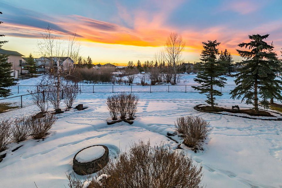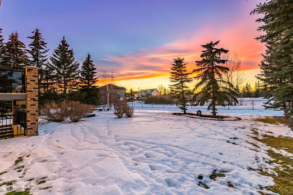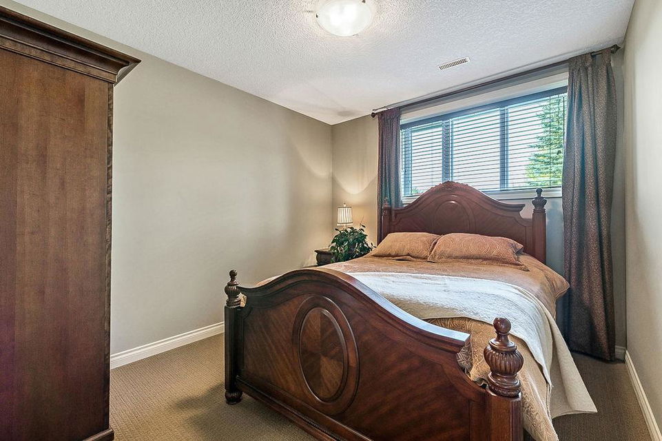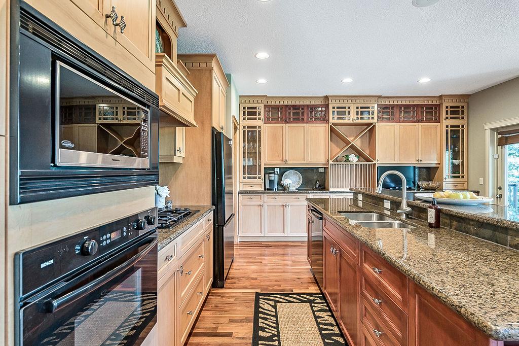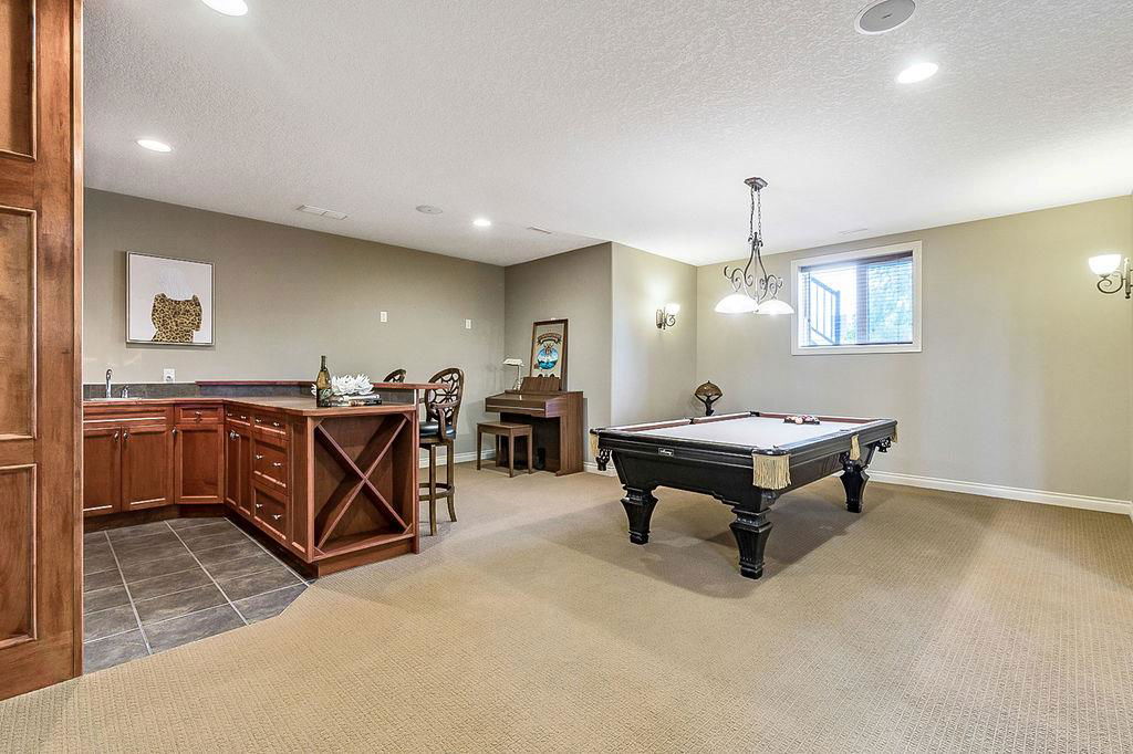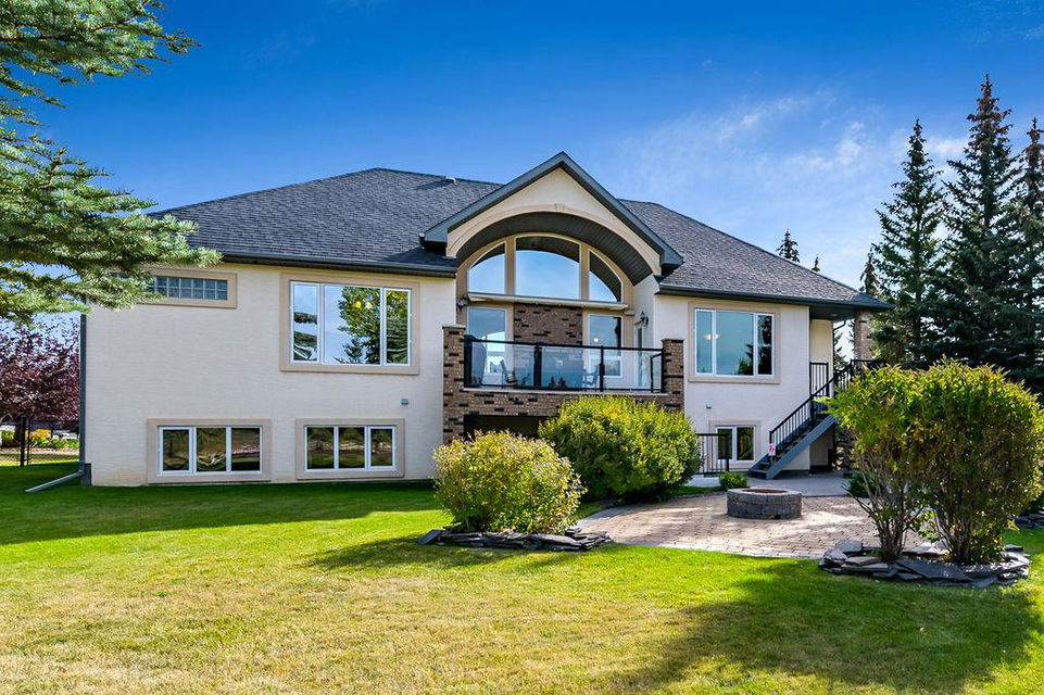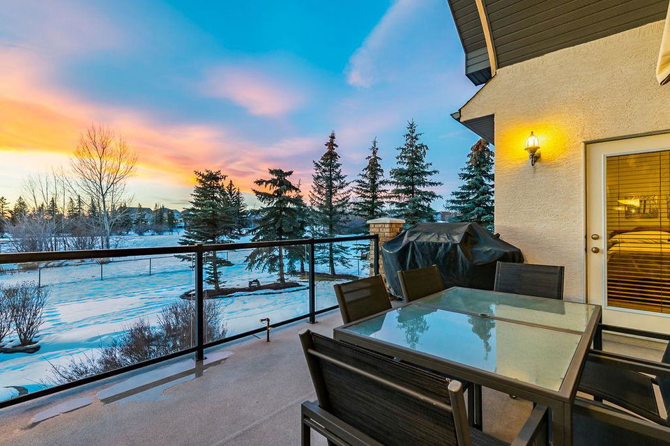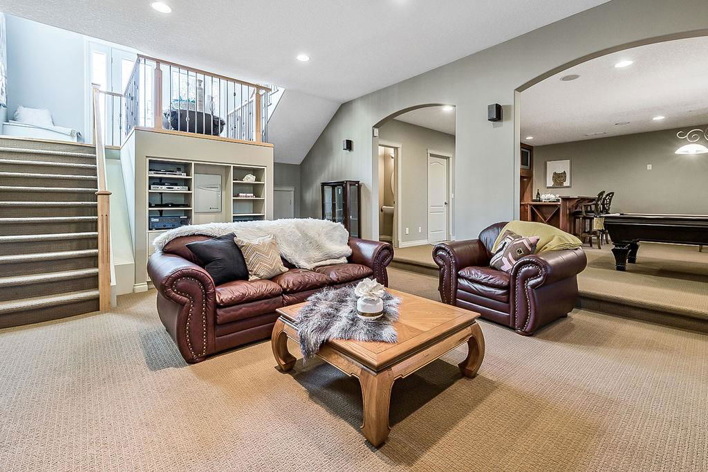 LUXURIOUS FORMER AIR RANCH SHOWHOME with superb layout, HUGE 1/3 ACRE LOT, AMAZING GOLF COURSE LOCATION … 2BDRMS up & 2BDRMS down, WEST yard, PLUS MOUNTAIN VIEWS! **Click 3D video for virtual walk-through**. MAIN floor features 1940sq.ft.+ space with large living room w two-way fire-place & vaulted ceiling, gourmet kitchen with custom maple cabinetry, large island & walk-in pantry, and superb dining with windows overlooking yard. Spacious owner’s suite boasts gorgeous ensuite bath with STEAM shower with 11 shower heads, soaker tub, walk-in closet, and double sink vanity. Main floor also features large den (or second bedroom), another full bathroom, and generous laundry room. Brazilian hardwood & slate floors throughout. LOWER level offers 1600sq.ft.+ more space, 11’ ceilings, family room with second fireplace, games room with custom bar & built-in TV’s, and two more bedrooms with full bathroom. IN-FLOOR HEAT, two furnaces, AC, smart wiring & sound surround throughout the house. GORGEOUS 170’ x 85’ YARD is beautifully landscaped with mature vegetation, irrigation system, concrete patio area, and spacious deck … and offers views of golf course & Rocky Mountains. PLUS OVERSIZED 22’x33’ garage, exposed aggregate driveway. If you are looking for luxurious bungalow-style living in a prestigious community, and enjoy golf course & mountain views, then this is it!