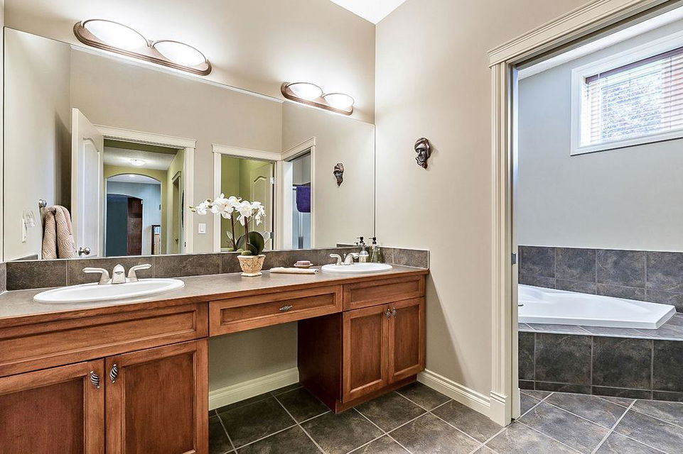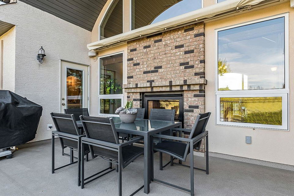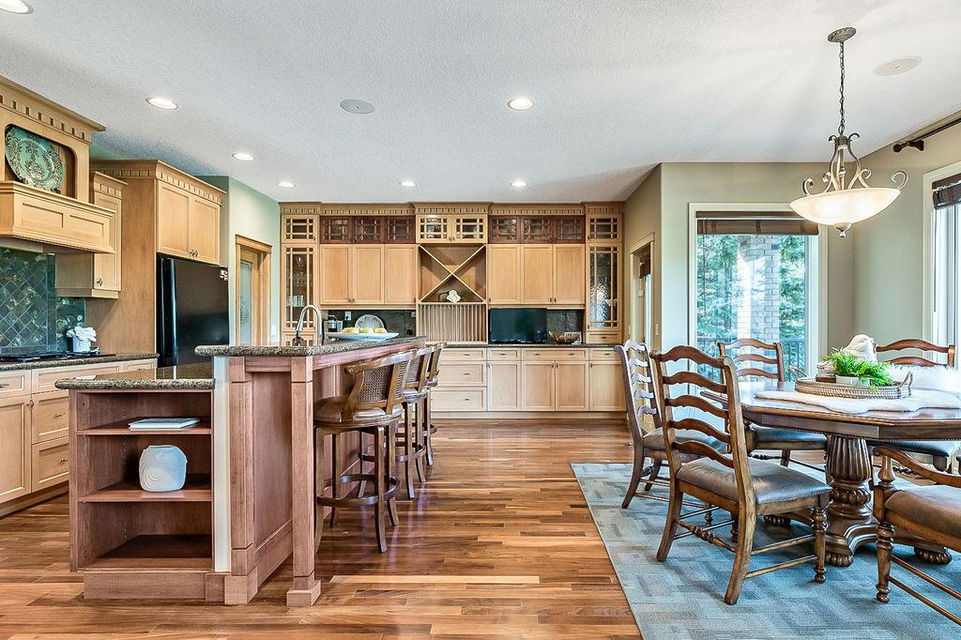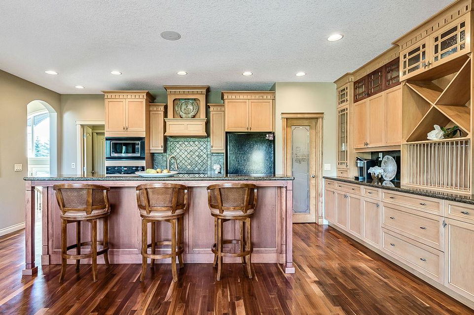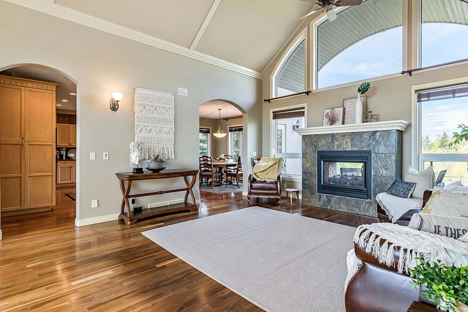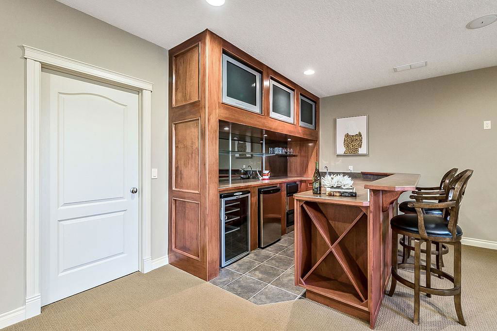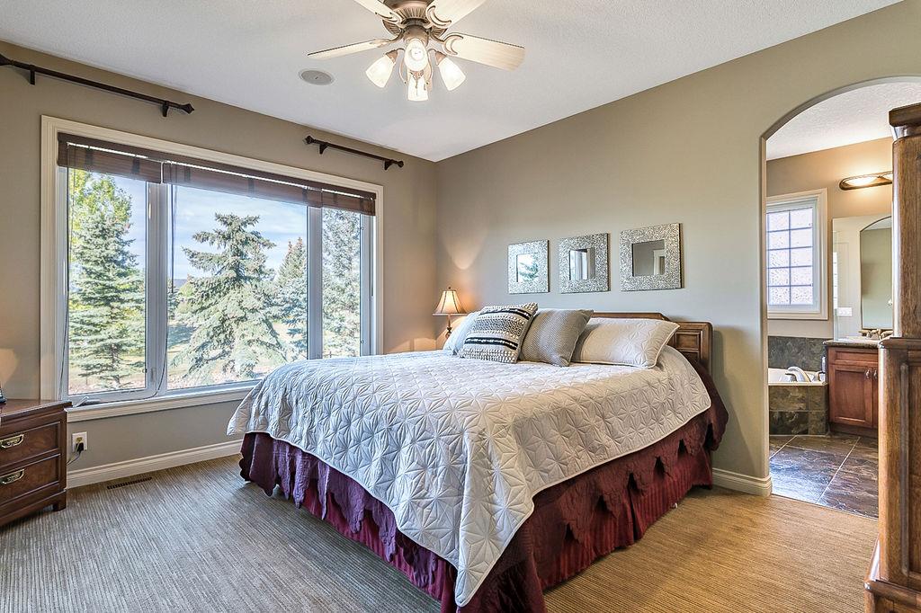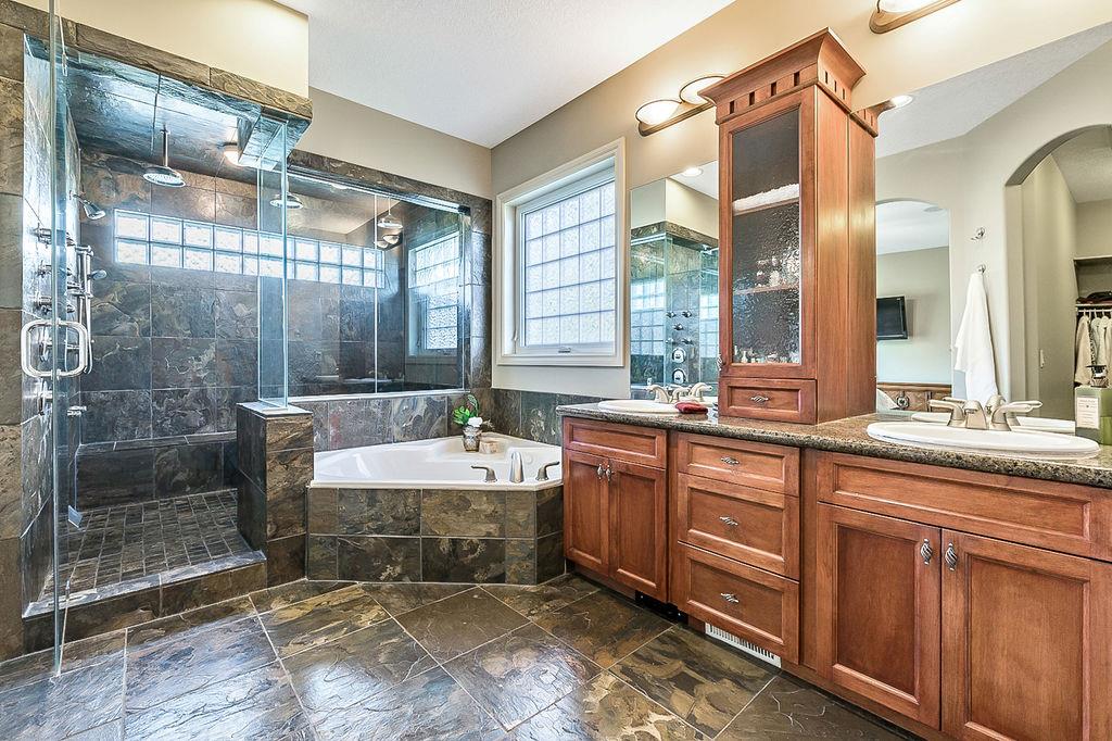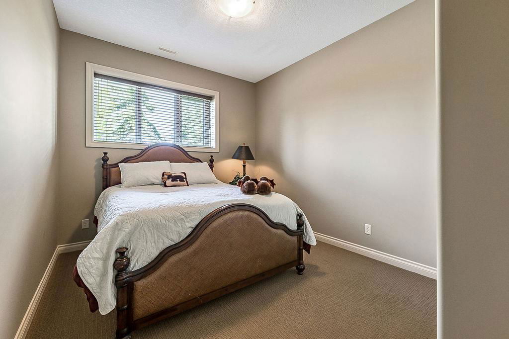 LUXURIOUS FORMER AIR RANCH SHOWHOME with superb layout, HUGE 1/3 ACRE LOT, AMAZING GOLF COURSE LOCATION … 2BDRMS up & 2BDRMS down, WEST yard, PLUS MOUNTAIN VIEWS! **Click 3D video for virtual walk-through**. MAIN floor features 1940sq.ft.+ space with large living room w two-way fire-place & vaulted ceiling, gourmet kitchen with custom maple cabinetry, large island & walk-in pantry, and superb dining with windows overlooking yard. Spacious owner’s suite boasts gorgeous ensuite bath with STEAM shower with 11 shower heads, soaker tub, walk-in closet, and double sink vanity. Main floor also features large den (or second bedroom), another full bathroom, and generous laundry room. Brazilian hardwood & slate floors throughout. LOWER level offers 1600sq.ft.+ more space, 11’ ceilings, family room with second fireplace, games room with custom bar & built-in TV’s, and two more bedrooms with full bathroom. IN-FLOOR HEAT, two furnaces, AC, smart wiring & sound surround throughout the house. GORGEOUS 170’ x 85’ YARD is beautifully landscaped with mature vegetation, irrigation system, concrete patio area, and spacious deck … and offers views of golf course & Rocky Mountains. PLUS OVERSIZED 22’x33’ garage, exposed aggregate driveway. If you are looking for luxurious bungalow-style living in a prestigious community, and enjoy golf course & mountain views, then this is it!