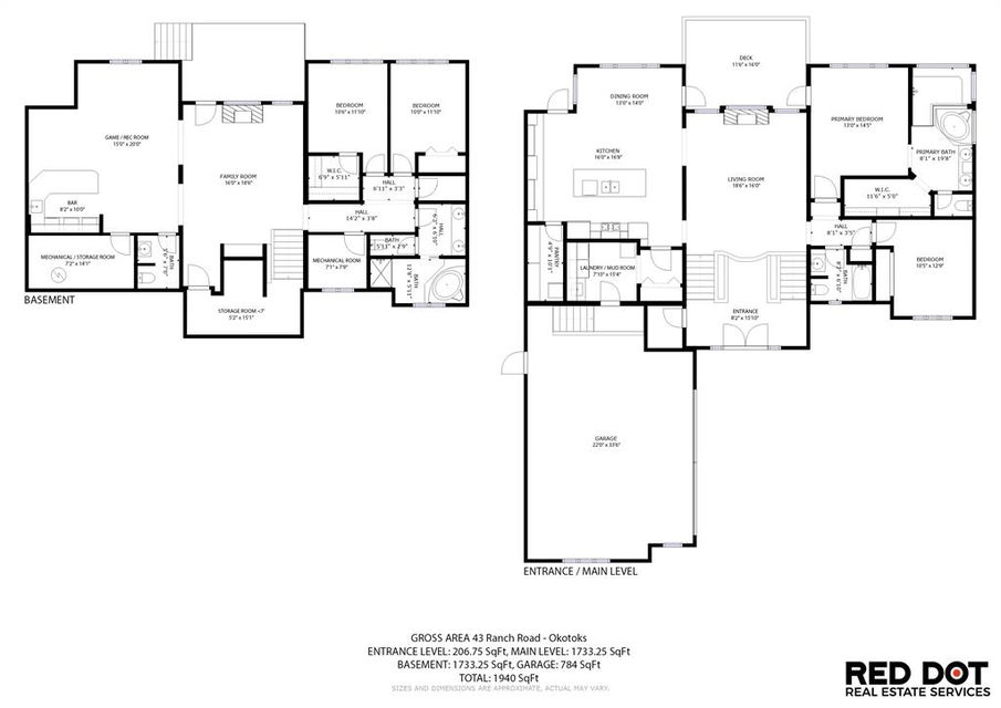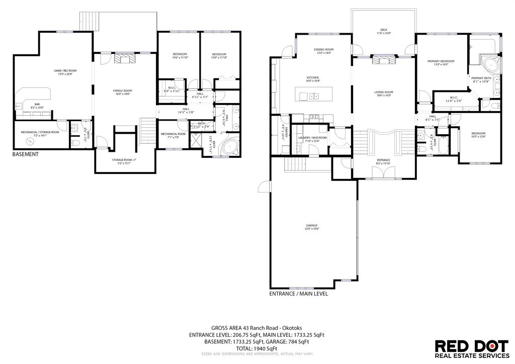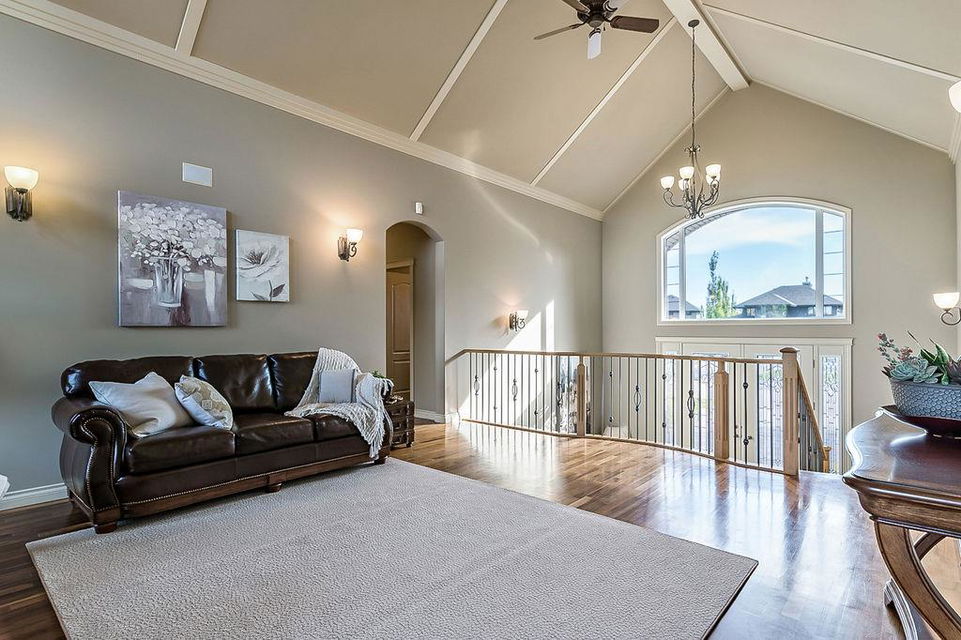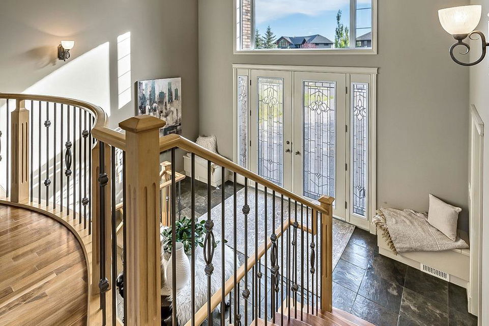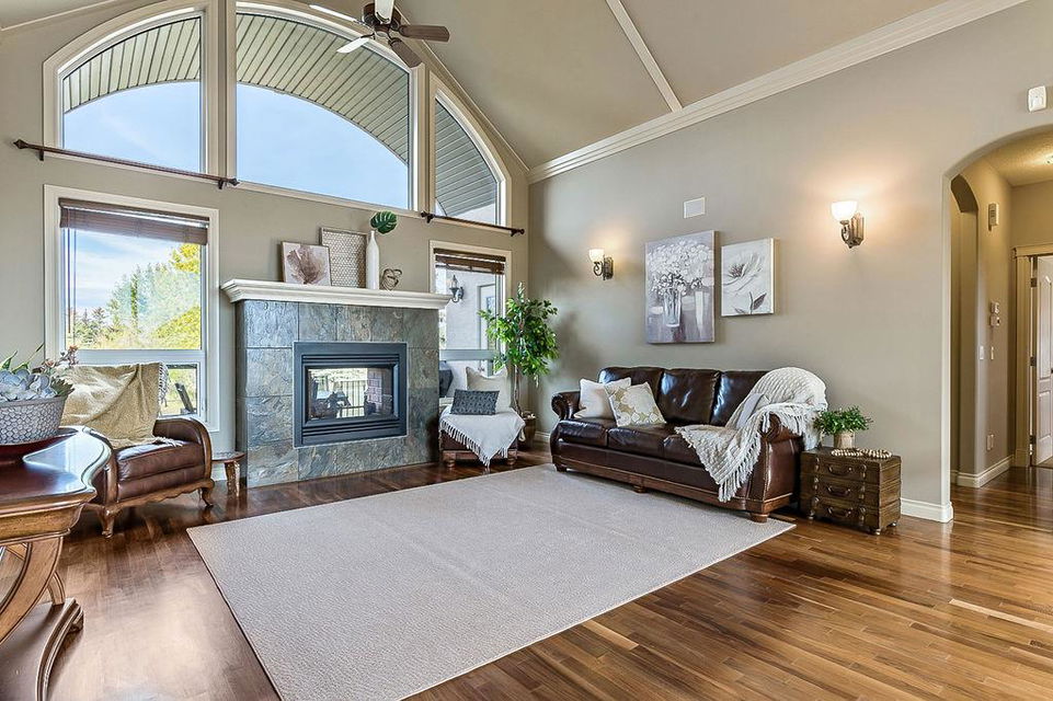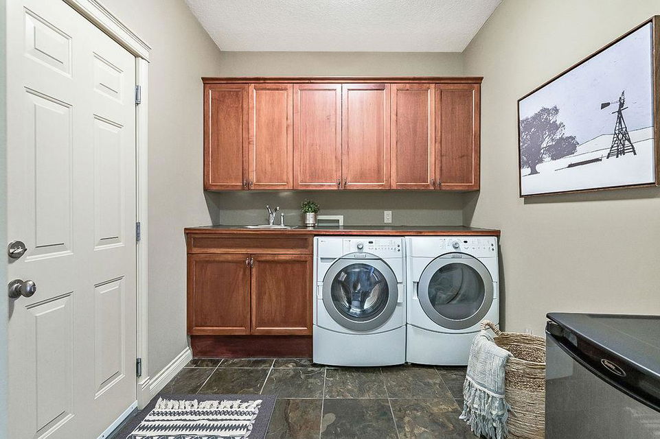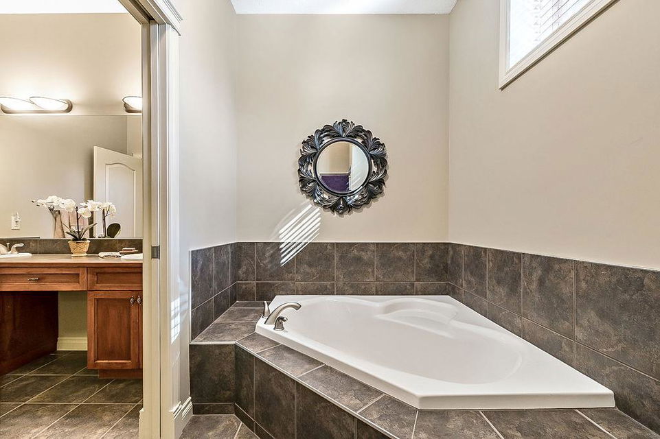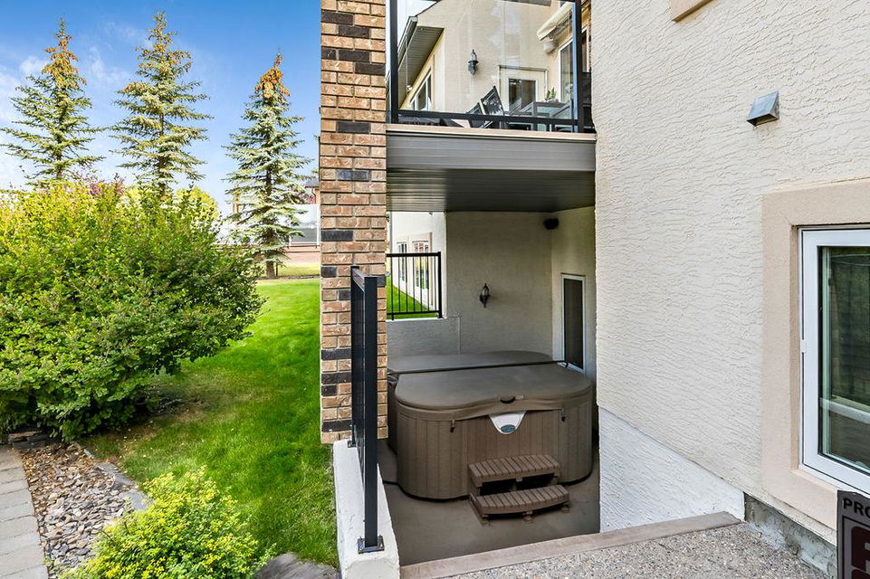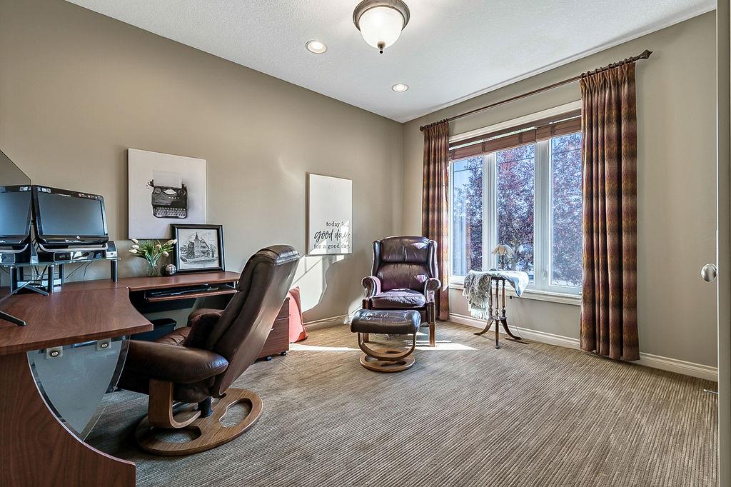 LUXURIOUS FORMER AIR RANCH SHOWHOME with superb layout, HUGE 1/3 ACRE LOT, AMAZING GOLF COURSE LOCATION … 2BDRMS up & 2BDRMS down, WEST yard, PLUS MOUNTAIN VIEWS! **Click 3D video for virtual walk-through**. MAIN floor features 1940sq.ft.+ space with large living room w two-way fire-place & vaulted ceiling, gourmet kitchen with custom maple cabinetry, large island & walk-in pantry, and superb dining with windows overlooking yard. Spacious owner’s suite boasts gorgeous ensuite bath with STEAM shower with 11 shower heads, soaker tub, walk-in closet, and double sink vanity. Main floor also features large den (or second bedroom), another full bathroom, and generous laundry room. Brazilian hardwood & slate floors throughout. LOWER level offers 1600sq.ft.+ more space, 11’ ceilings, family room with second fireplace, games room with custom bar & built-in TV’s, and two more bedrooms with full bathroom. IN-FLOOR HEAT, two furnaces, AC, smart wiring & sound surround throughout the house. GORGEOUS 170’ x 85’ YARD is beautifully landscaped with mature vegetation, irrigation system, concrete patio area, and spacious deck … and offers views of golf course & Rocky Mountains. PLUS OVERSIZED 22’x33’ garage, exposed aggregate driveway. If you are looking for luxurious bungalow-style living in a prestigious community, and enjoy golf course & mountain views, then this is it!