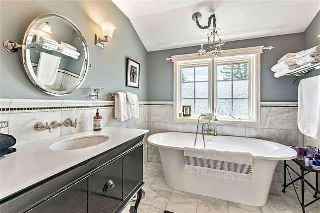 Stunning two story 4bdrm SCARBORO home FULLY RENOVATED & EXPANDED imbued w classic old-world charm and premier modern luxury. Fantastic floorplan, lovely indoor/outdoor flow, designer finishing, high ceilings, hardwood. Main floor features gracefully-proportioned living rm (or study), gas fireplc w stately mantelpiece, hand-carved surround, dining rm w antique stained-glass doors to cozy library w window seat, French-country style kitchen w professional gas range/oven, English handmade tiles, centre island, butler’s pantry, Herbeau plumbing & hammered copper sink. Open to fam room w efficient wood-burning frplce, vaulted ceiling, huge Pella architectural windows forming conservatory stepping out to south back garden, beautifully landscaped w ornamental trees, perennials, brick patio. Upper floor master bdrm has built-in closets, ensuite bath & Steamcore shower, two more bdrms, and another bathroom w Victoria & Albert freestanding soaker tub, PLUS upstairs laundry. MUD ROOM is complete with built-in storage, cute plant/dog-shower. LOWER LEVEL is perfect for guests, live-in nanny or extra space for family. It features 4th bedrm, spacious rec rm, and space for future full bath & wine cellar. Single garage with lane access. Front garden very private w downtown view. In one of the BEST NEIGHBOURHOODS, few min to schools (Sunalta), 17th Ave, bike paths & hardly a commute: 8 mins downtown.
